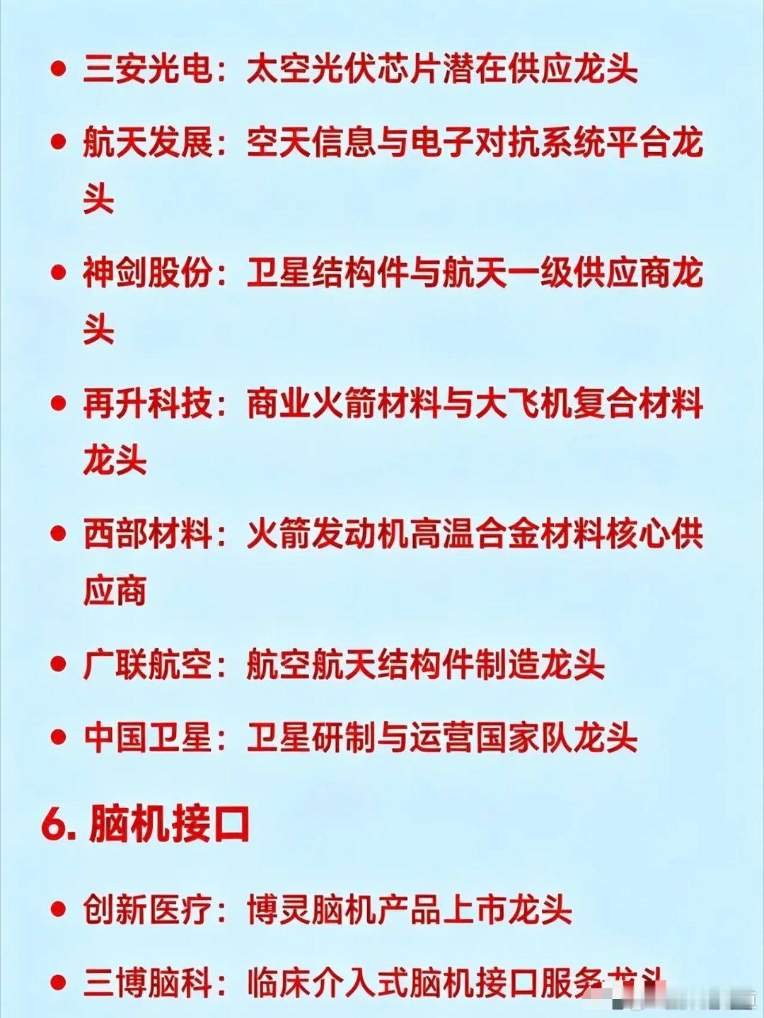 5. 商业航天龙头中国卫通:低轨卫星互联网运营国家队航天电器:航天电子连接器核心供应商三安光电:太空光伏芯片潜在供应龙头航天发展:空天信息与电子对抗系统平台神剑股份:卫星结构件与航天一级供应商再升科技:商业火箭材料与大飞机复合材料西部材料:火箭发动机高温合金材料核心供应商广联航空:航空航天结构件制造中国卫星:卫星研制与运营国家队