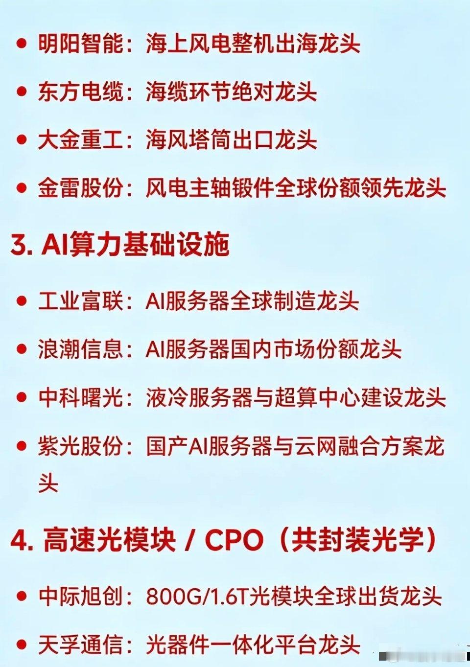 2. 风电(整机/海风/出口)龙头节能风电:央企风电运营金风科技:全球陆上风电整机明阳智能:海上风电整机出海东方电缆:海缆环节绝对大金重工:海风塔筒出口金雷股份:风电主轴锻件全球份额领先
