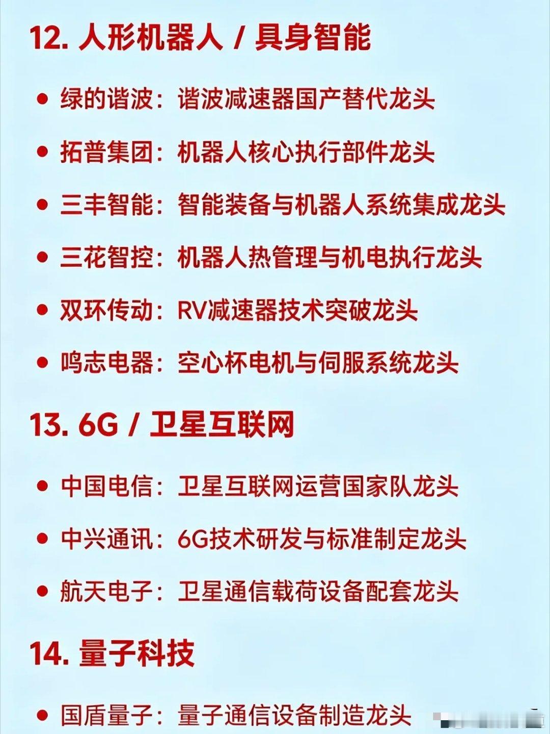 12. 人形机器人 / 具身智能龙头绿的谐波:谐波减速器国产替代拓普集团:机器人核心执行部件三丰智能:智能装备与机器人系统集成三花智控:机器人热管理与机电执行双环传动:RV减速器技术突破鸣志电器:空心杯电机与伺服系统