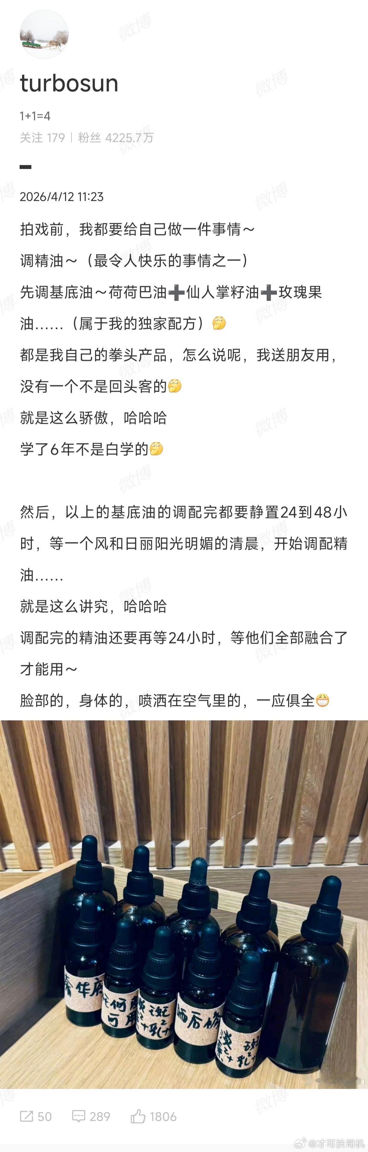 孙俪分享自调精油配方孙俪发文分享独家自调精油配方,文字间充满了风趣和骄傲,从她不