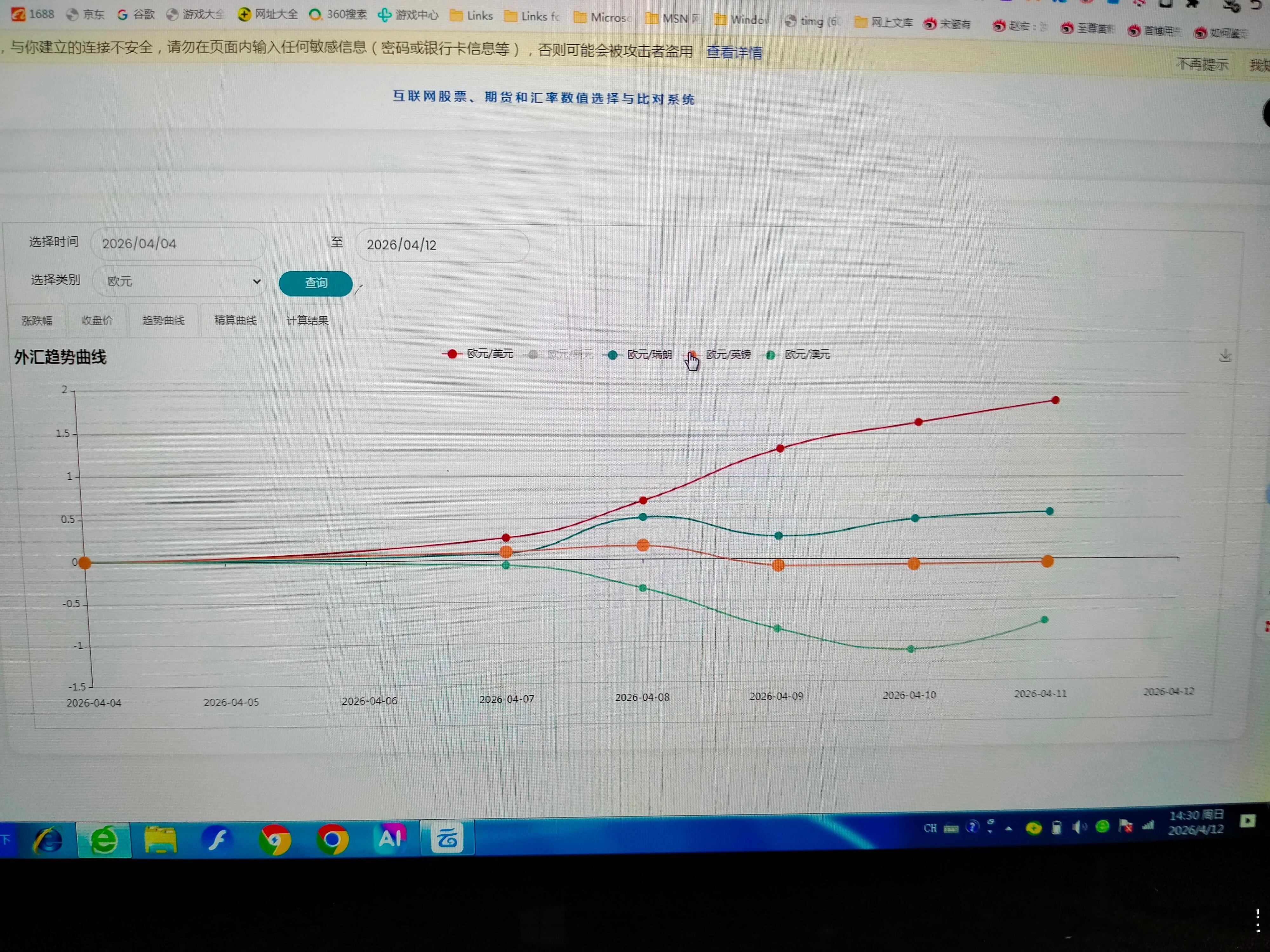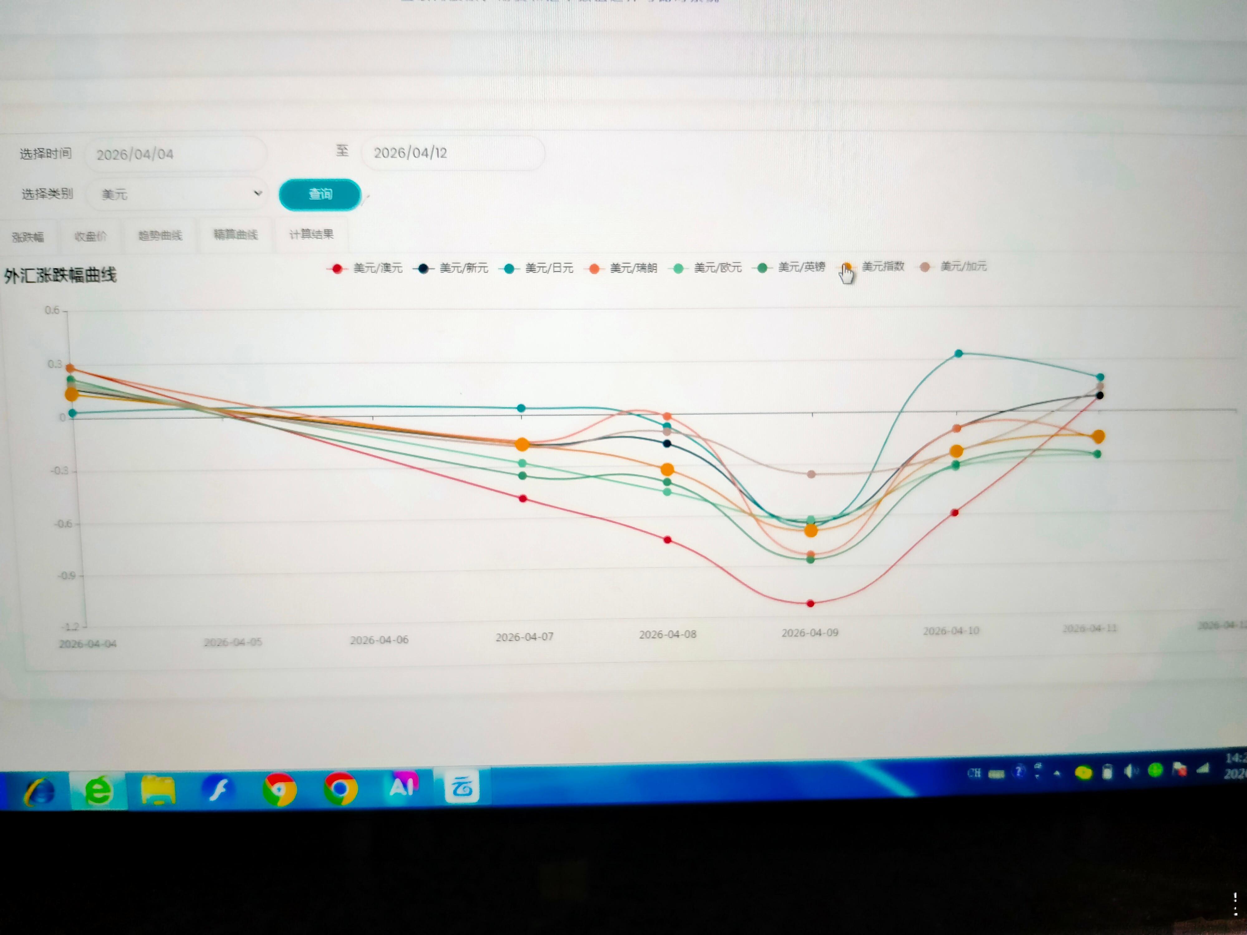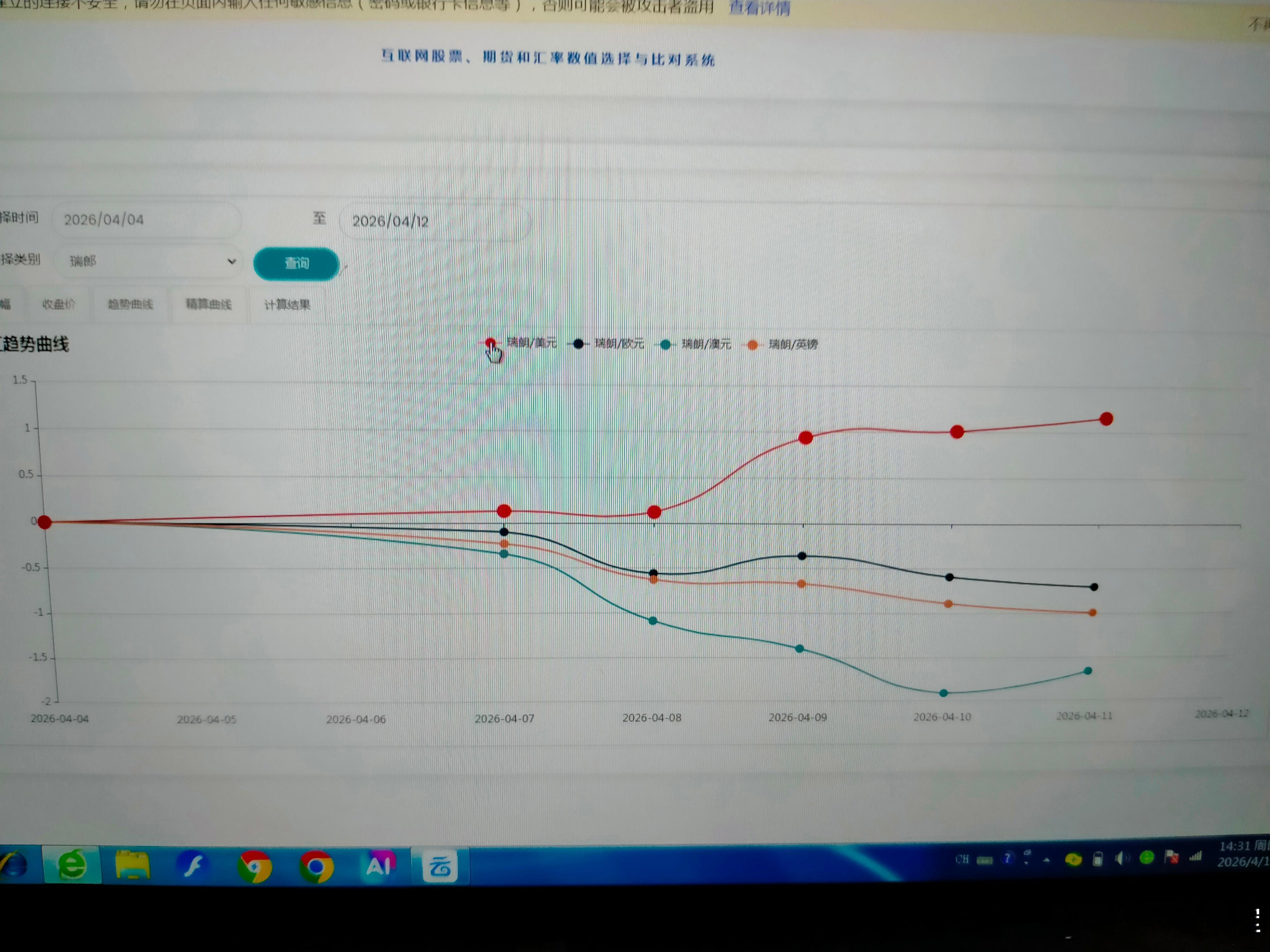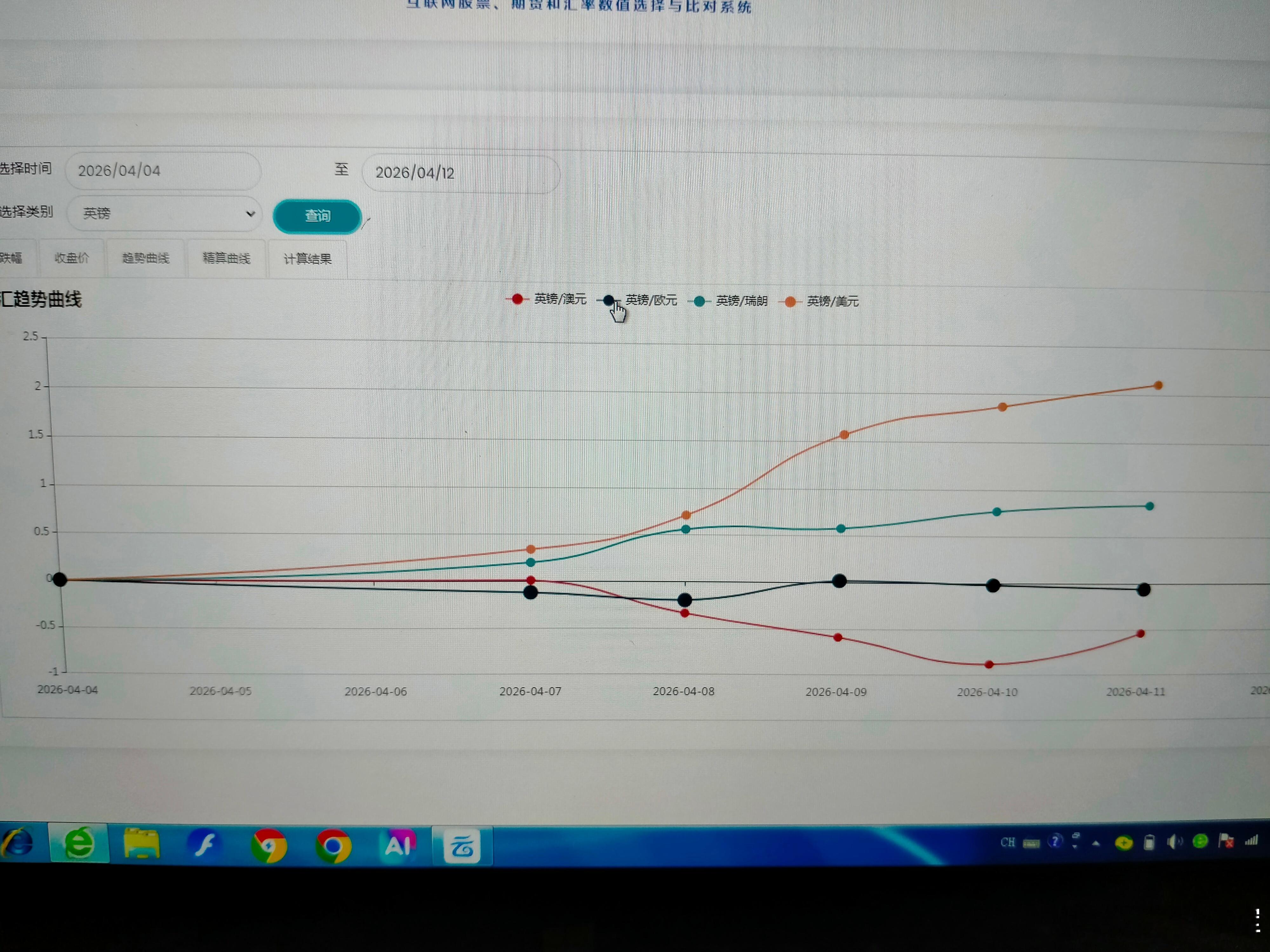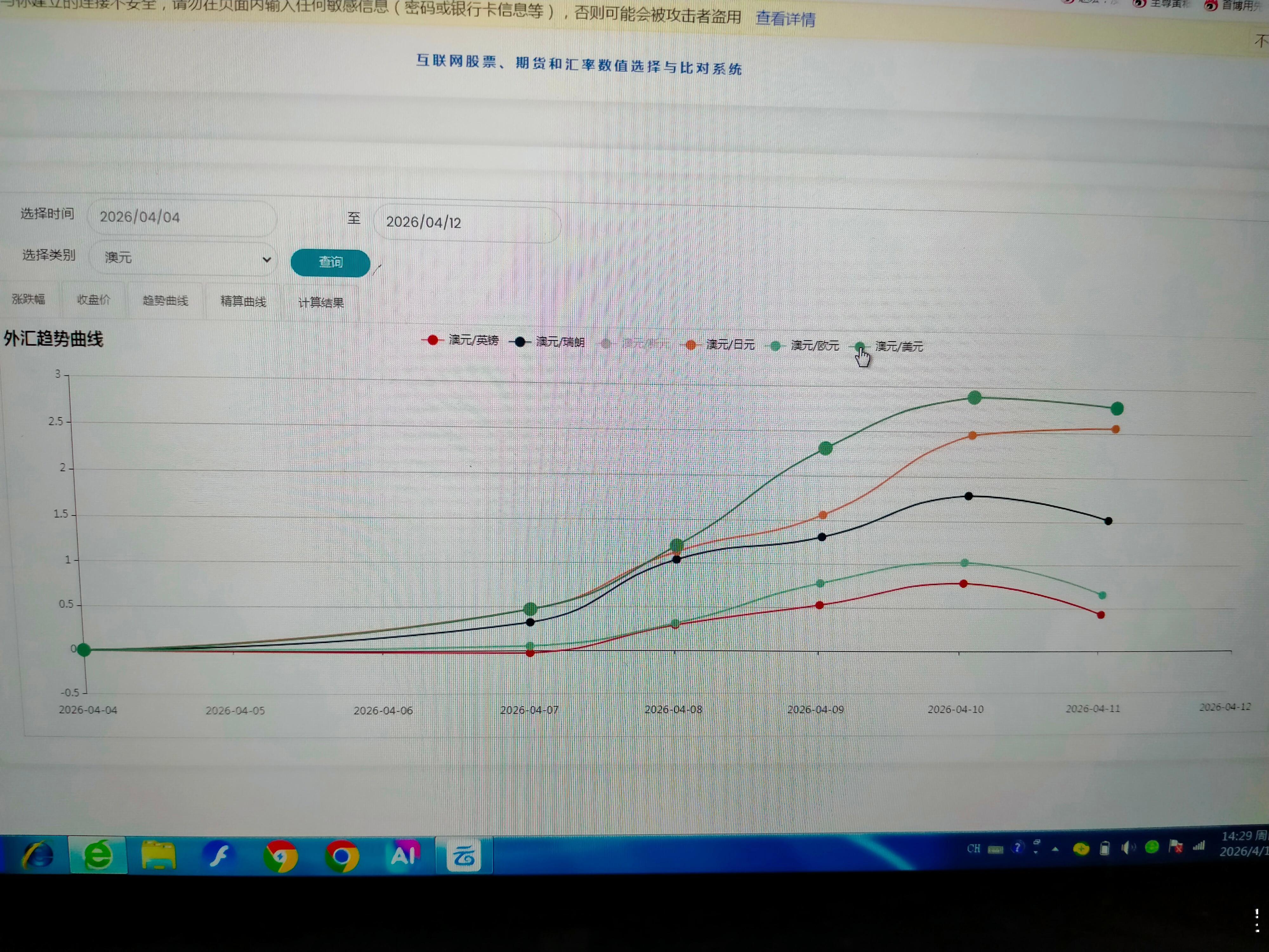 本周主要汇率走势 本周实势方面最大的事件就是中东冲突出现两周的谈判期,受此影响,美元走弱,澳元最强,欧元和英镑走强。 图一是美元本周的涨跌幅曲线,连跌五天,图二是趋势曲线,兑其他几个主要币种都是下跌的。估计下周不会再这么惨吧? 图三是澳元本周的趋势曲线,澳元本周涨幅比较大,下周估计也不会再延续如此强势。 图四是欧元本周的趋势曲线,图五是英镑本周的趋势曲线,图六是瑞郎本周的趋势曲线,欧元和英镑基本持平,瑞郎弱一点。基本上与冲突期相比,现在是处于平衡缓冲的态势。 图七是兑日元的趋势曲线,图八是兑加元的趋势曲线,日元是仅次于美元的弱势币种,加元也仅比日元强一点。 图九是正向和反向态势图,美元进入低位区域,澳元进入高位区域。澳元要注意风险了吧?市场短期可能都比较谨慎,看看实势往哪个方向变化。