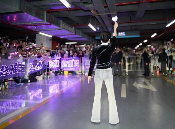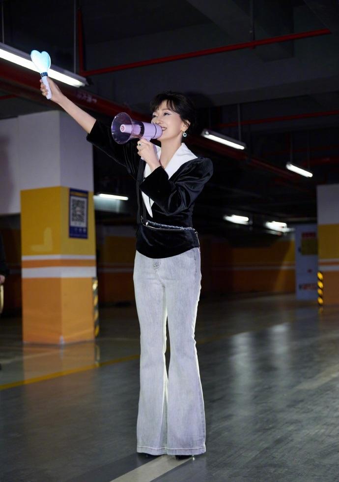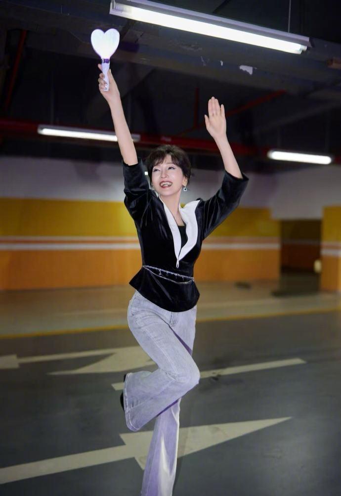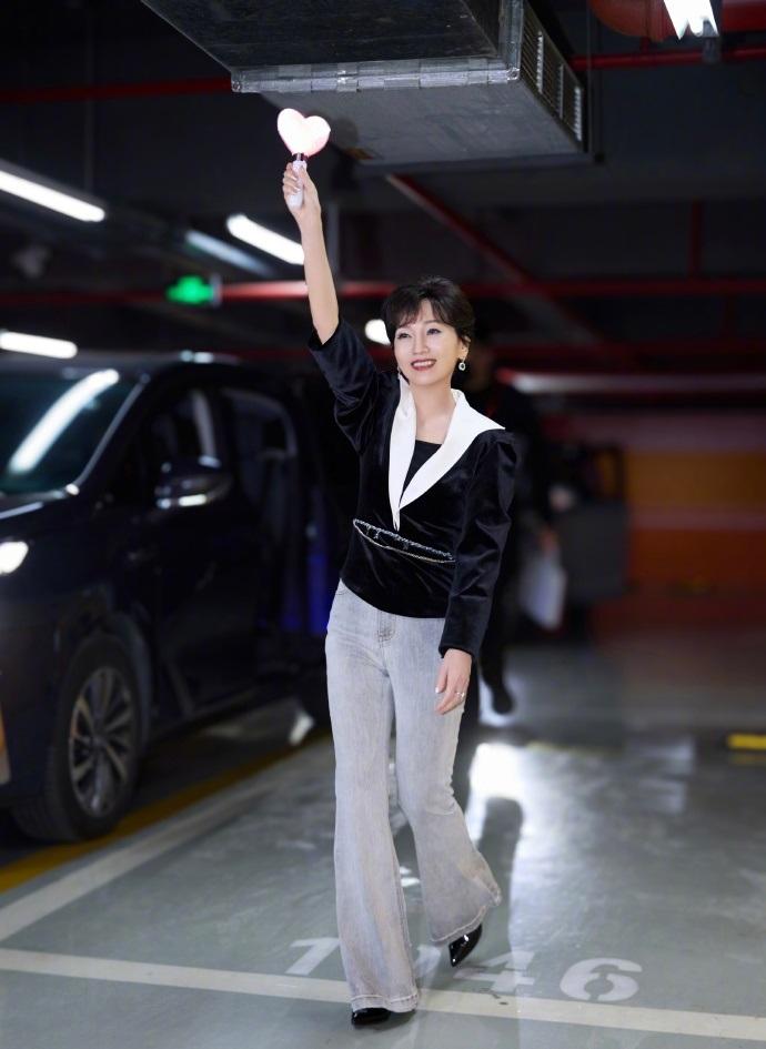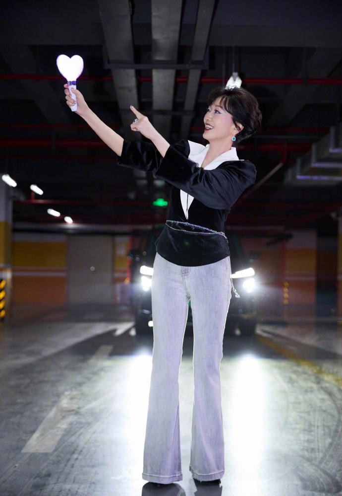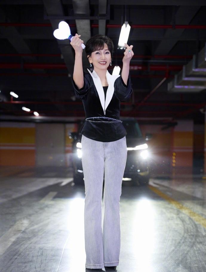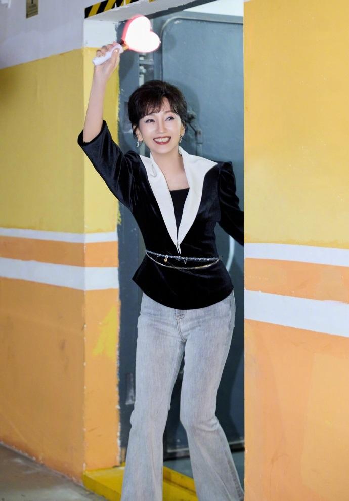 赵雅芝上身穿黑色的绒面服饰,下身搭配做旧风格的牛仔裤,还展现出了完美的身材比例。