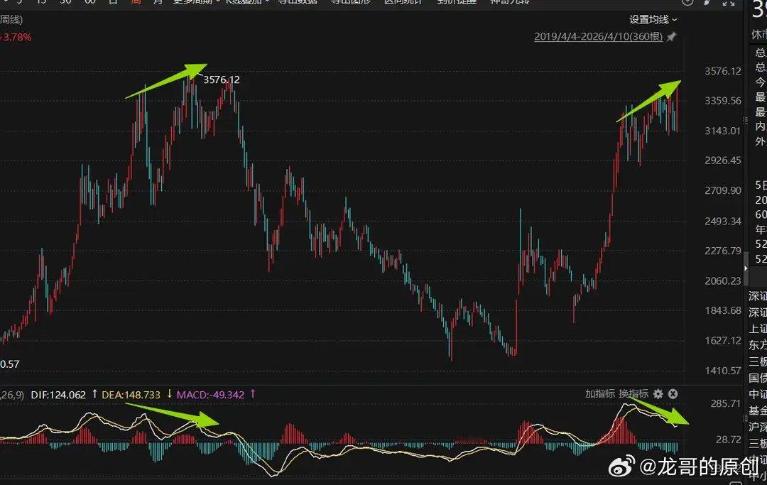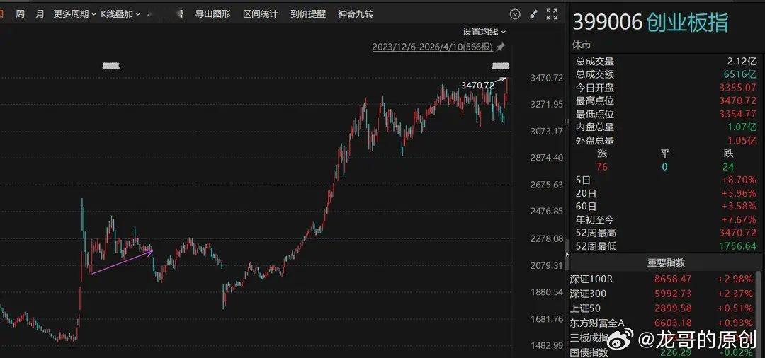 最近A股行情彻底火了,海外局势慢慢缓和,全球资金风险偏好回升,三大指数从3月底就一路往上冲。截至4月11日,创业板指直接突破2021年12月的高点,创下4年多来的新高!市场一片欢呼雀跃,不少人喊着“大牛市启动”,但也有人心里打鼓:这波暴涨,到底是新一轮行情的起点,还是阶段性冲顶的信号?结合技术走势、市场结构和机构观点,老郭直接给结论:创业板现在更像是阶段冲顶,而非真正的牛市开启,周线顶背离、权重独撑、机构抱团这三大信号,都在提醒大家别盲目追高。一、技术面预警:周线顶背离,上涨动力快耗尽了炒股的朋友都知道,顶背离是行情见顶的重要信号,简单说就是:指数越涨越高,但MACD指标却没跟上,反而往下走,红柱也越来越短。这背后的意思很直白:表面看着涨得猛,实际推动上涨的资金和动能已经跟不上了。现在的创业板就是典型:指数刷出4年新高,周线MACD却持续走低,红柱面积大幅缩水,形成清晰的周线顶背离。翻一下历史就懂了,创业板2021年2月、12月两次出现周线顶背离后,都迎来了大幅阶段性调整。更危险的是,不光创业板,沪深两市也同步出现背离信号,多指数共振,调整的概率只会更大。二、行情太假:指数狂欢,却是权重股“一个人的表演”这波创业板新高,看着热闹,其实绝大多数散户根本没赚到钱,典型的“赚了指数不赚钱”。创业板前8大权重股,占了整个板块超53%的权重,光宁德时代一家就占近20%,中际旭创、新易盛这些光模块龙头,权重也都超7%。4月10日创业板大涨超4%,宁德时代、中际旭创等权重股涨幅超6%,三只票就贡献了指数一半以上的涨幅。可同期创业板个股涨跌幅中位数只有0.83%,超过一半的股票,涨幅远不如指数。这种二八分化的行情,基础特别脆弱:全靠几只大权重股拉着指数跑,一旦这些权重股获利盘出逃,没有其他个股接盘,指数分分钟会快速回调。三、资金真相:不是增量资金进场,就是存量资金抱团很多人以为行情火爆是新资金大举入场,其实根本不是,这就是存量资金的抱团游戏。宁德时代融资余额超200亿,中际旭创、东方财富也都是融资盘大户,公募基金一季报显示,新能源、光模块、AI算力这些龙头,早就成了机构的核心持仓。市场成交量看似放大,可资金全扎堆在少数权重股里,没有全面放量普涨,说白了就是:资金从小盘股撤出来,集中去拉权重股,用有限的资金把指数推到新高。这种抱团行情最怕“翻脸”:一旦权重股业绩不及预期、估值太高,或者有外部利空,机构抱团一散,就会出现“多杀多”的急跌。现在高位股已经崩了一批:汇源通信5连板后直接跌停,新能泰山两连跌停,法尔胜、舒华体育也双双跌停,纯情绪炒作的资金,已经开始慌了。四、长期是利好,短期有风险,业绩要“验真金”不可否认,创业板有政策红利加持,证监会优化上市规则,长期肯定利好新兴产业发展,但政策利好是慢功夫,撑不起短期这么猛的暴涨。这波反弹的核心原因,就是海外地缘冲突缓和,全球风险偏好提升,可地缘局势的变数还在,根本没彻底稳定。而且上证指数4000点上方套牢盘太多,很难一次性冲过去,还得反复震荡。创业板这波上涨,更多是前期超跌后的修复,不是彻底的牛市反转。眼下4月正是年报、一季报密集披露期,业绩就是最好的试金石。如果权重股业绩跟不上现在的股价,靠情绪推高的估值必然要回调,机构抱团一瓦解,指数调整只会更猛。最后总结:别被新高冲昏头,谨慎控仓才靠谱总的来说,创业板这波4年新高,就是海外情绪回暖+机构抱团拉权重的结果,不是新一轮大牛市的开启。周线顶背离的技术风险、权重独撑的虚假行情、存量抱团的脆弱资金面,都在提示:现在盲目追高很危险,大概率是阶段冲顶。给大家的操作建议很简单:别被指数的狂欢迷惑,重点盯着两点:权重股的资金流向、一季报的业绩情况。一旦出现量能萎缩、权重冲高回落、业绩不及预期,赶紧减仓控风险。长期看好创业板的新兴产业没问题,但短期一定要留个心眼,谨慎一点,才能在震荡市里守住收益,走得更稳。👉 大家觉得创业板这波是真突破还是假新高?评论区聊聊你的看法!👍 觉得有用的朋友,点赞+在看,转发给身边还在追高的朋友!