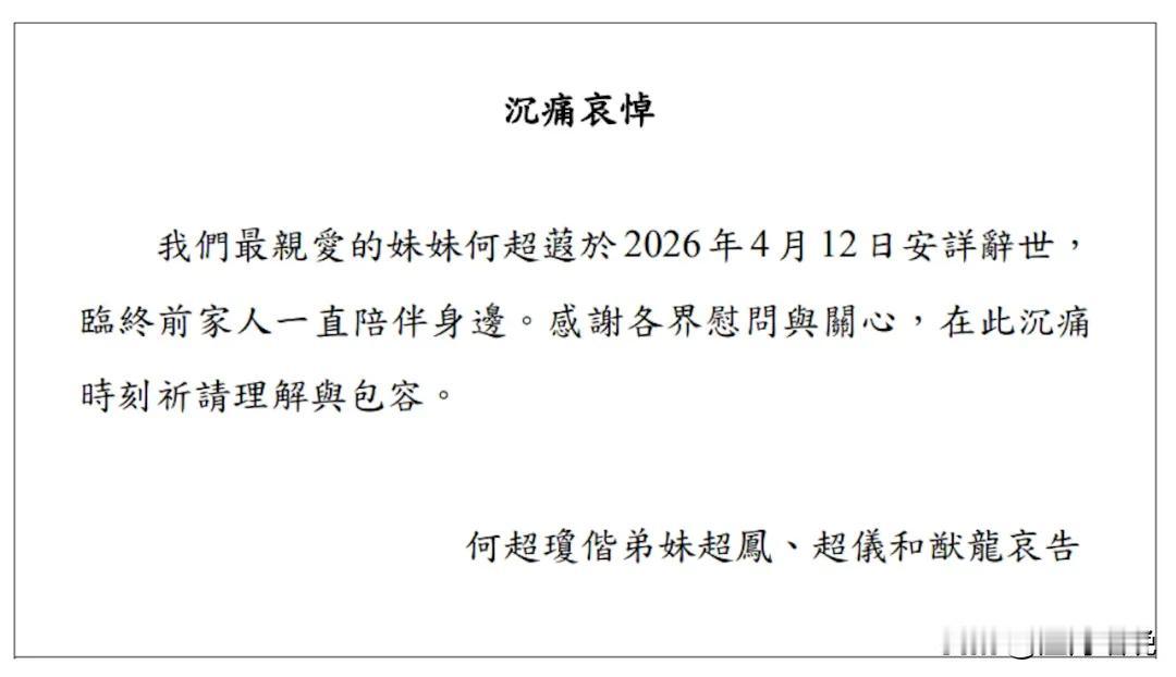 赌王千金何超蕸安详离世,一生低调奉献获家人陪伴 2026年4月12日,澳门信