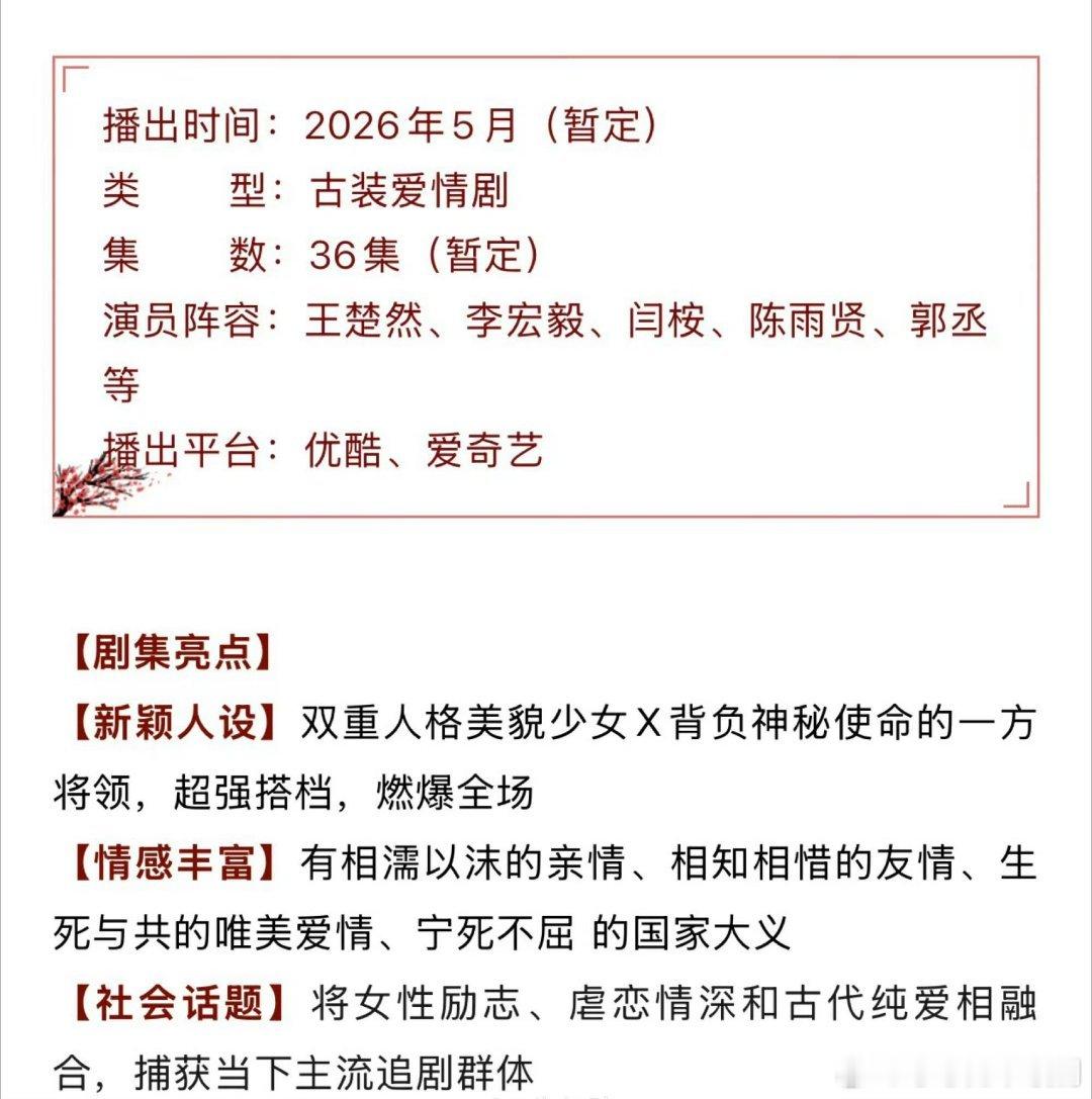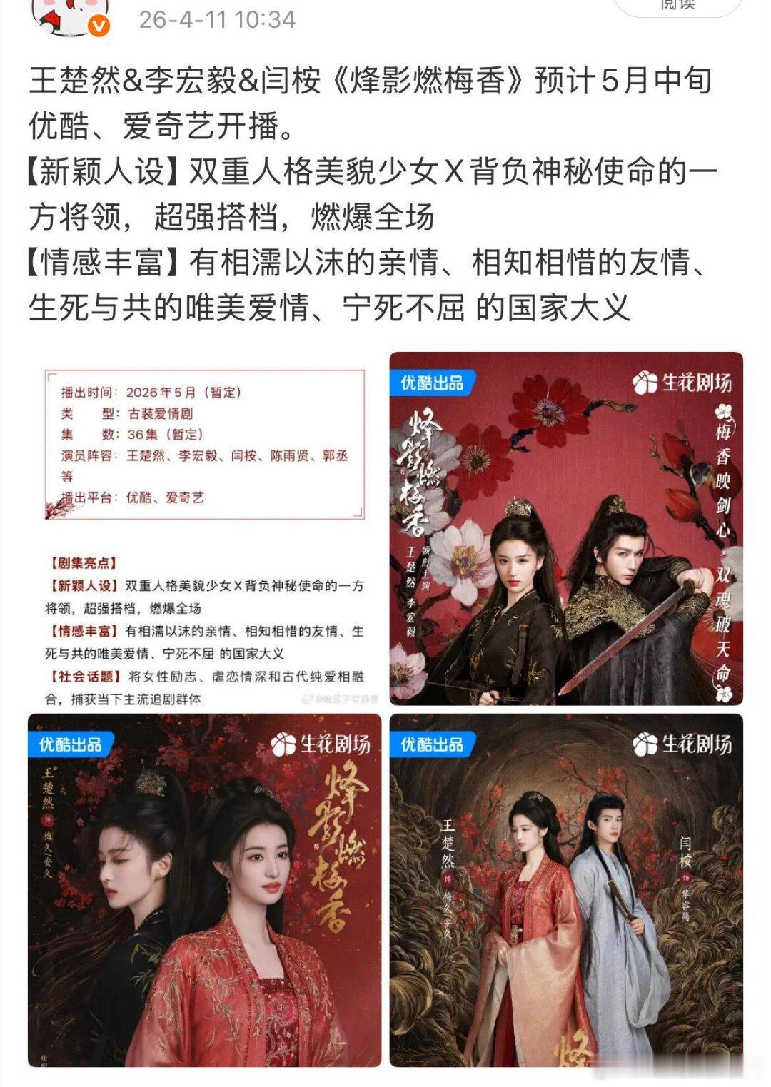 王楚然&李宏毅&闫桉《烽影燃梅香》预计5月中旬优酷、爱奇艺开播烽影燃梅香‖