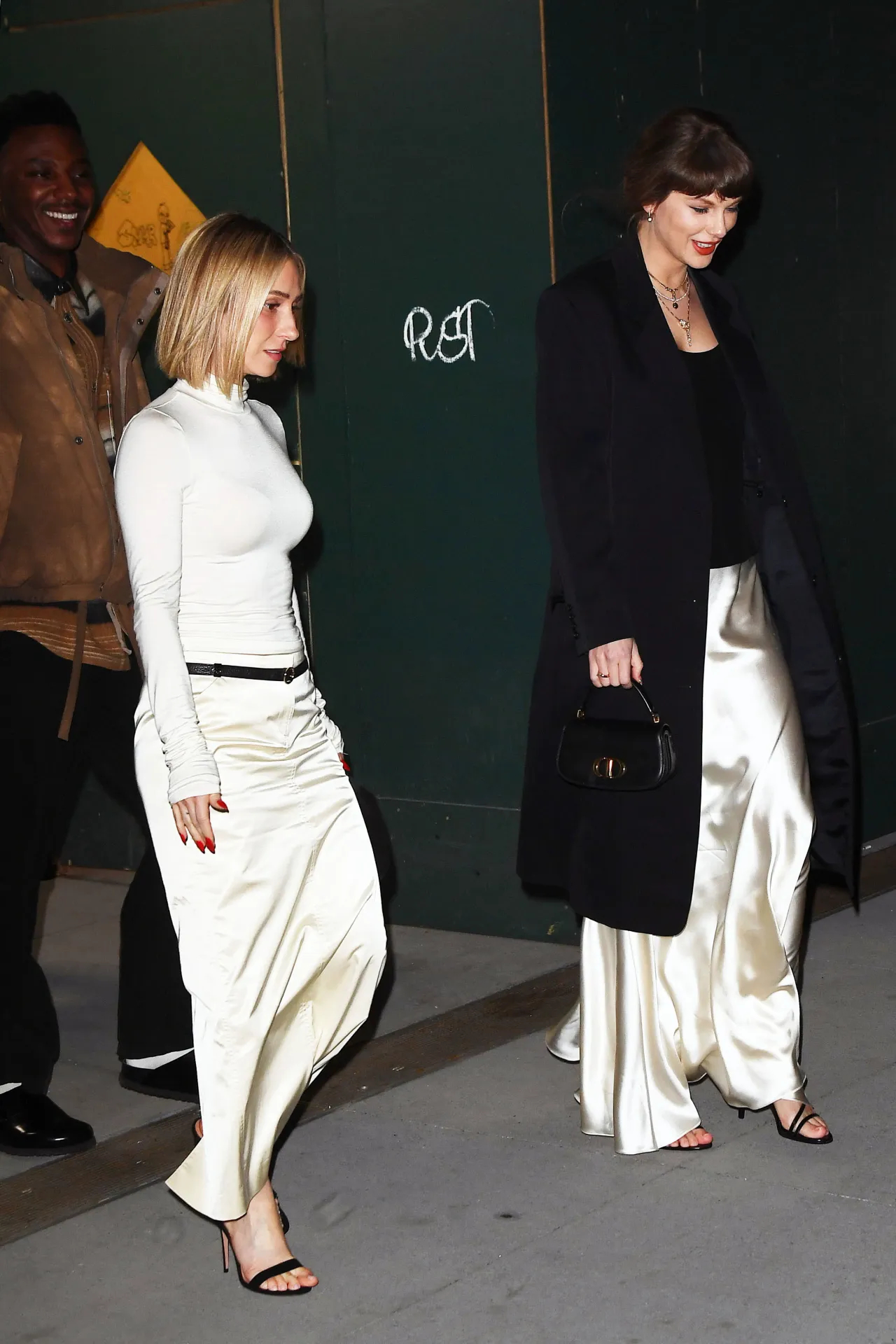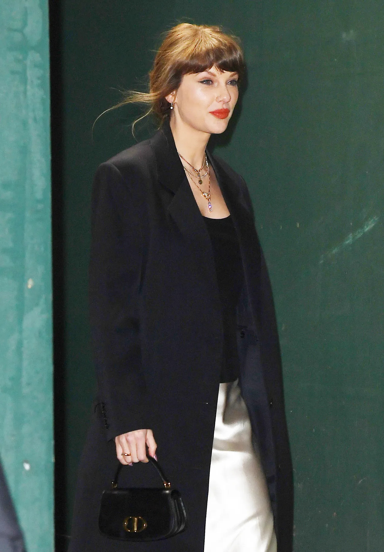 前两天Taylor Swift纽约街拍,穿了一件长款深色外套内搭黑色吊带背心,下