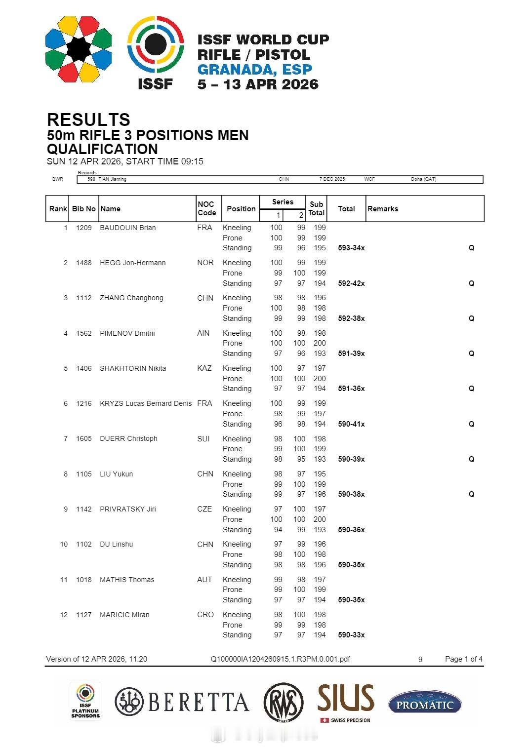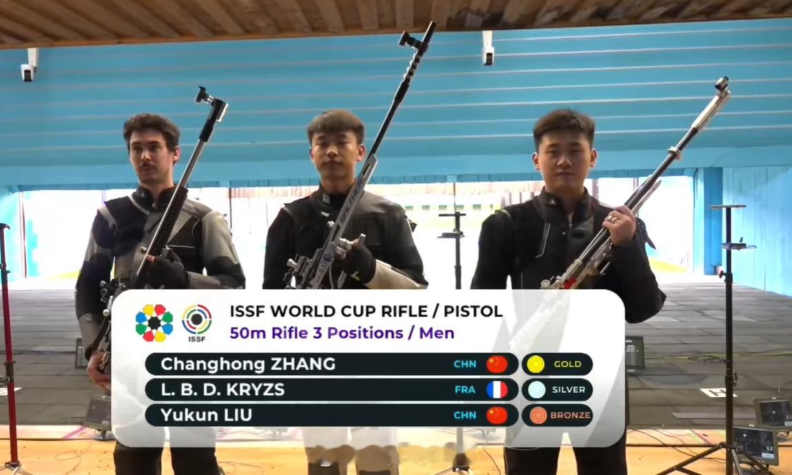 【射击世界杯张常鸿王者归来问鼎步枪三姿 刘宇坤摘铜】国际体坛战报速递 4月12日西班牙格拉纳达,射击世界杯(步手枪)西班牙站结束男子步枪三姿比赛,中国两位奥运冠军携手闯进决赛。东京奥运冠军张常鸿在立射阶段发挥出色,以358.8环夺得金牌。这也是张常鸿时隔7年重回世界杯领奖台。巴黎奥运冠军刘宇坤最后两枪失准,获得铜牌。法国克里斯落后张常鸿1.6环摘得银牌。在淘汰阶段前一直强势领跑的瑞士选手杜尔从立射倒数第三枪开始突然掉线,最终仅排名第五。