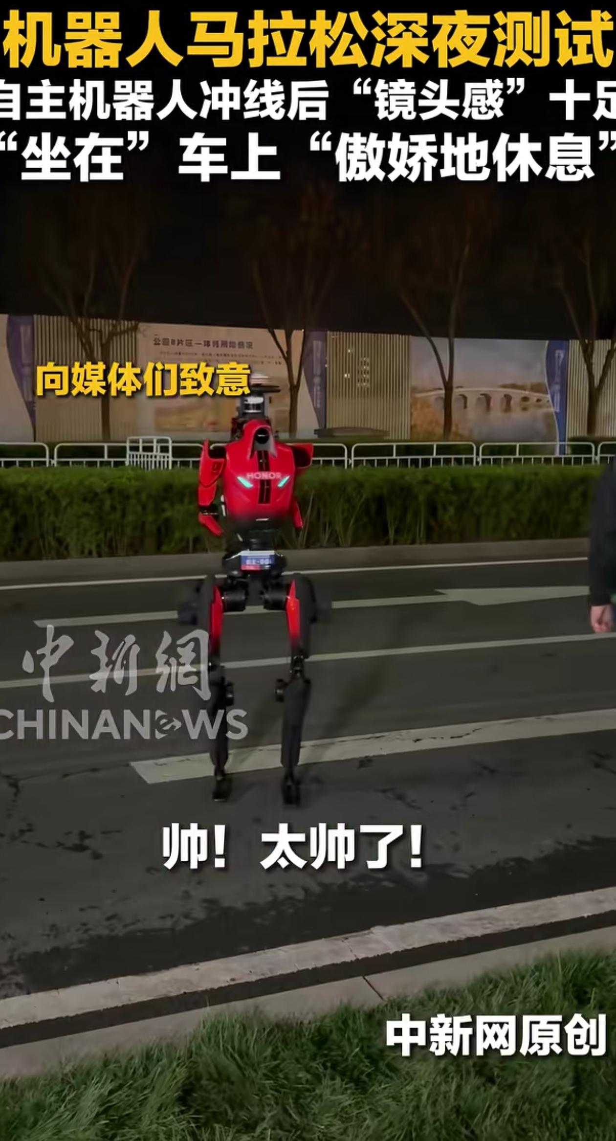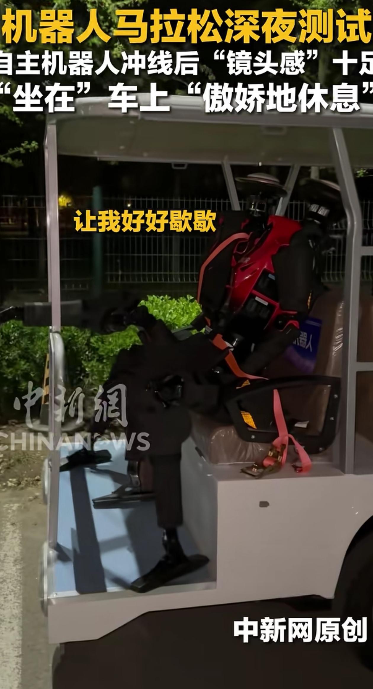 太硬核了!北京机器人马拉松竞赛,一个红色机器人跑完全程之后,不仅大摇大摆地接受观众喝彩,之后还像人一样,把脚搭在小车前的栏杆上休息。