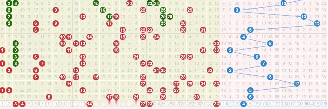 本期红球呈现两组连号:03与04,以及22与23;同尾码包括03、23、33以及04、14两对;斜连码开出22,未有重号出现。