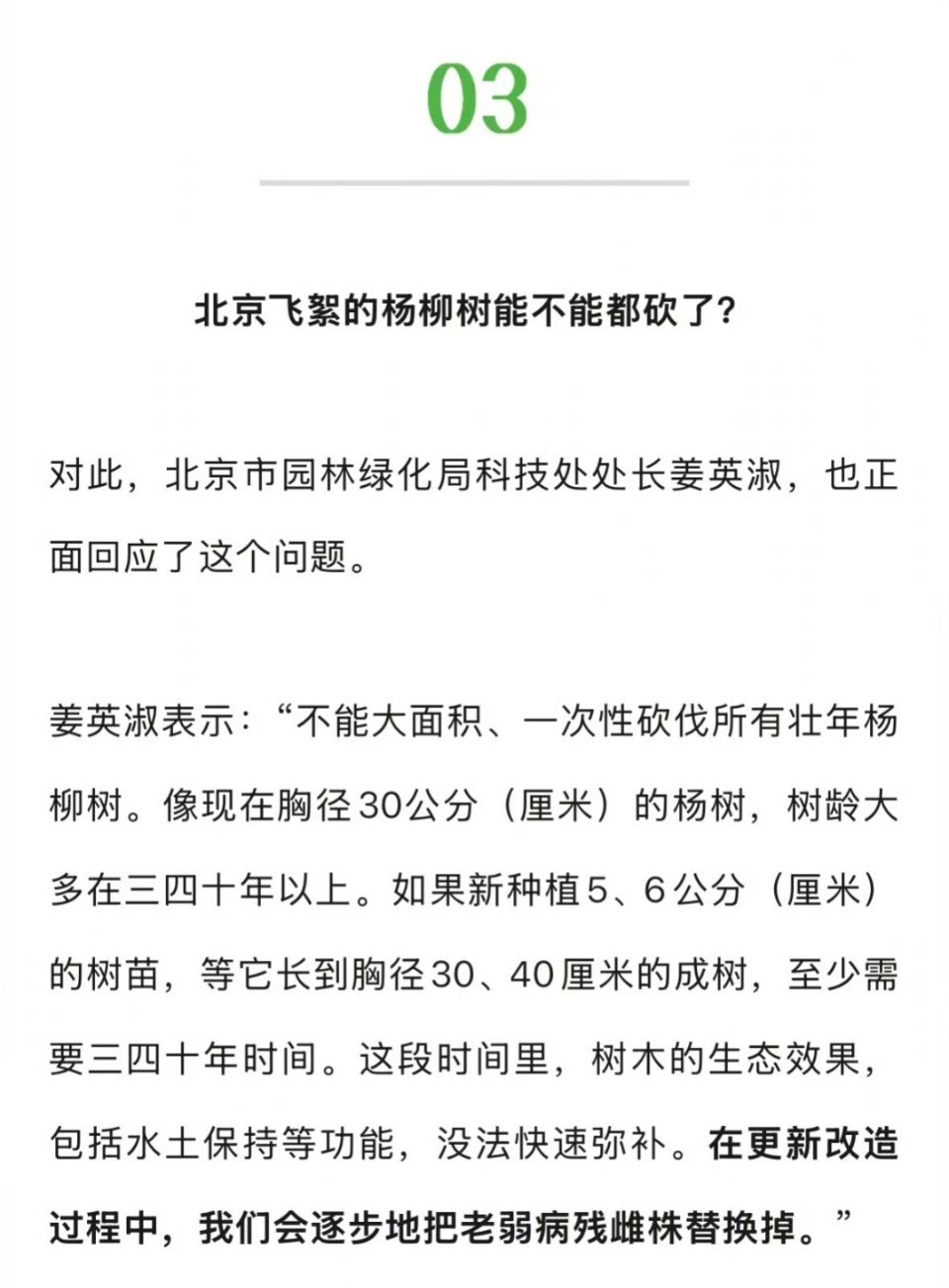 每年一到飘絮的时候,好多人都喊着要把杨柳树全砍了。但真全砍了,夏天少了大片阴凉,城市绿化成本翻几倍,水土保持、生态链也都会受影响。飞絮确实烦人,但一刀切砍树真不是办法。与其全砍,不如慢慢换品种、做抑絮处理,既解决问题,也不会毁了城市的绿色。官方回应为什么不能把杨柳树都砍了