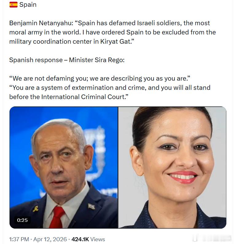西班牙青年与儿童事务部长——西拉·雷戈部长:“我们不是在诋毁你们,我们只是在如实描述你们的样子。”“你们是一个进行灭绝与犯罪的体系,你们所有人最终都将站在国际刑事法院面前接受审判。”