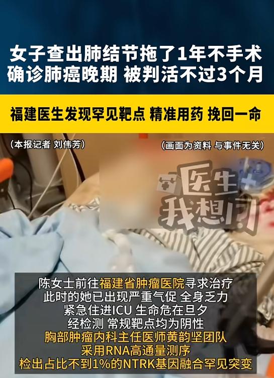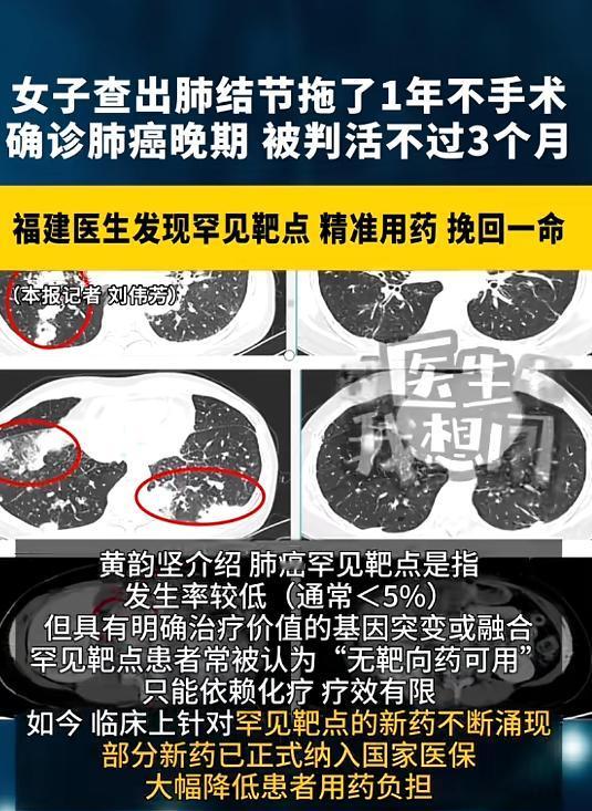 “不幸中的万幸!”2023年,福建福州,一女子体检时,发现肺部有数个小结节,但她拒绝了手术,长期服用偏方,一年多后确诊肺癌晚期,预估生存期可能不足3个月,好在最后医生发现了罕见靶点,精准用药,成功挽救了女子的性命!网友:真是奇迹啊!