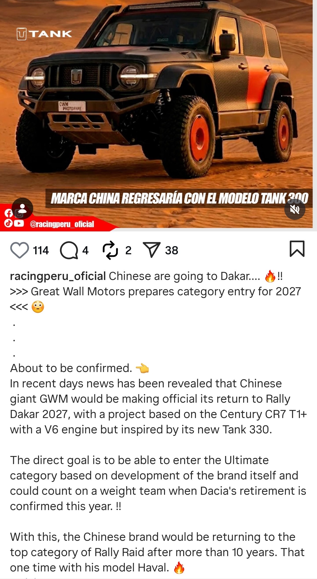 海外媒体报道:长城汽车将于2027年参与达喀尔拉力赛T1+组别,赛车将基于坦克330 V6版本打造