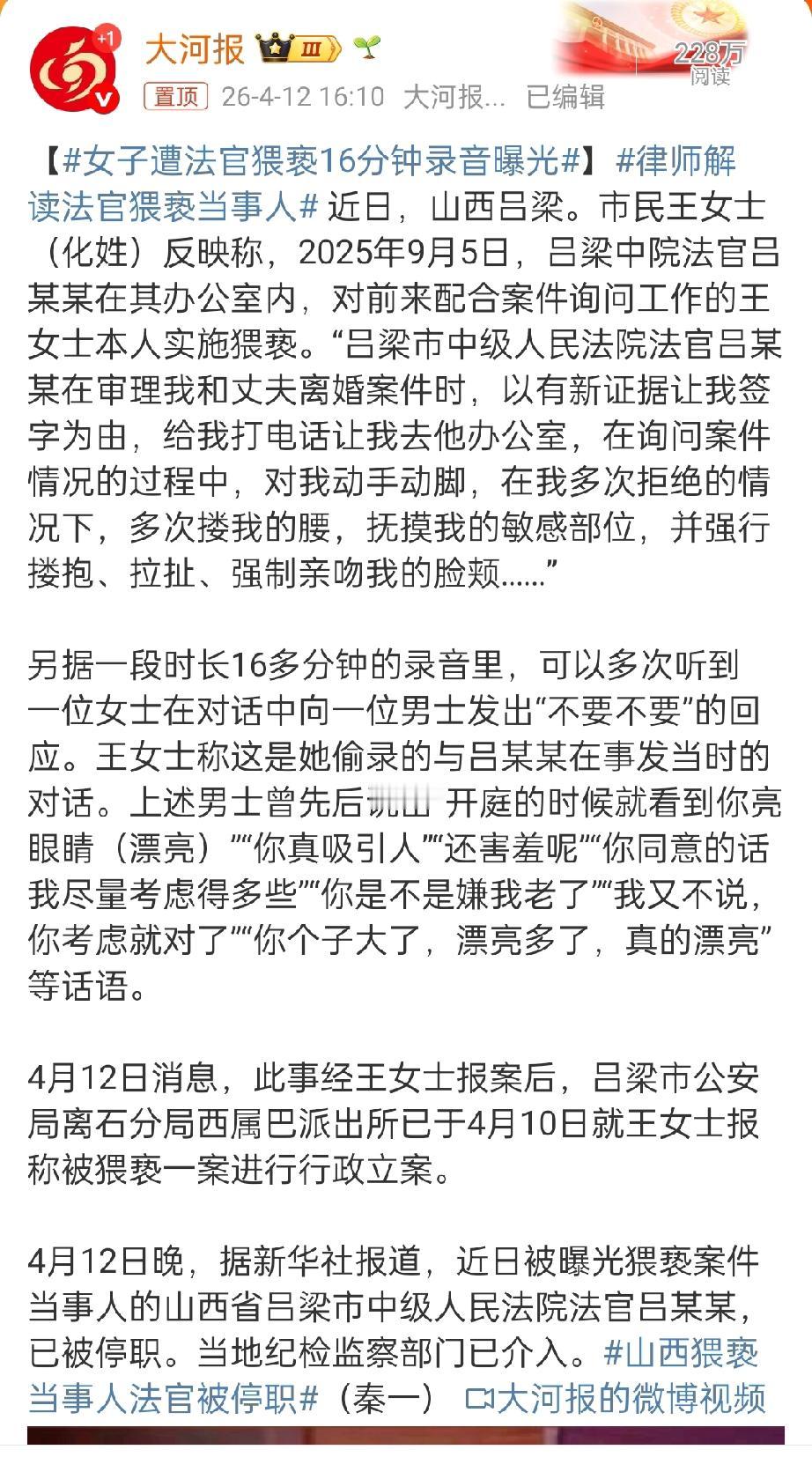 法官在司法殿堂的办公室里,用职权作胁迫工具,把法律威严之地变成猥亵犯罪现场,不仅是对当事人的践踏,更是对司法公信力的侵蚀。建议从严追责、彻查监管失职。 吕梁身边事