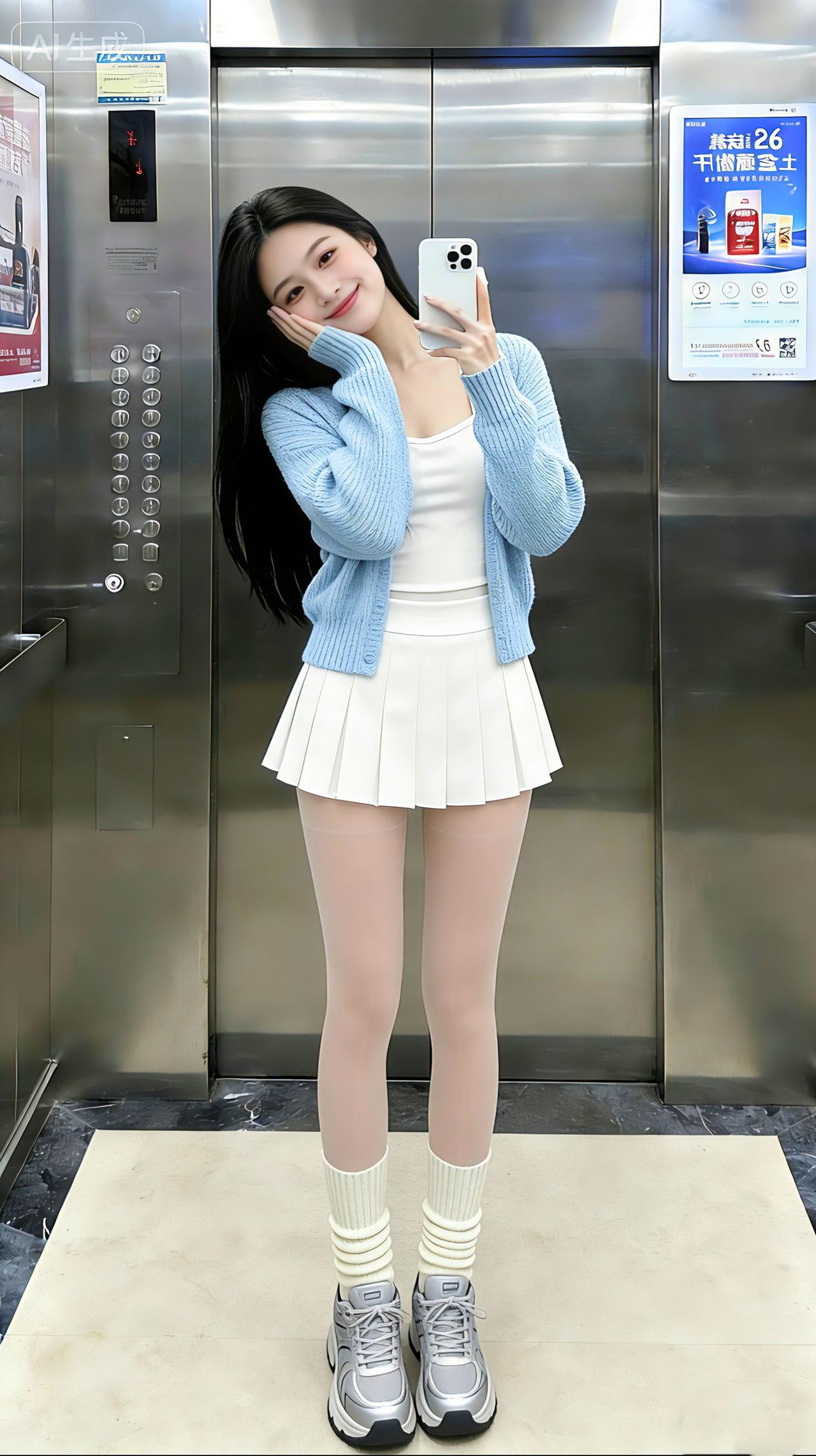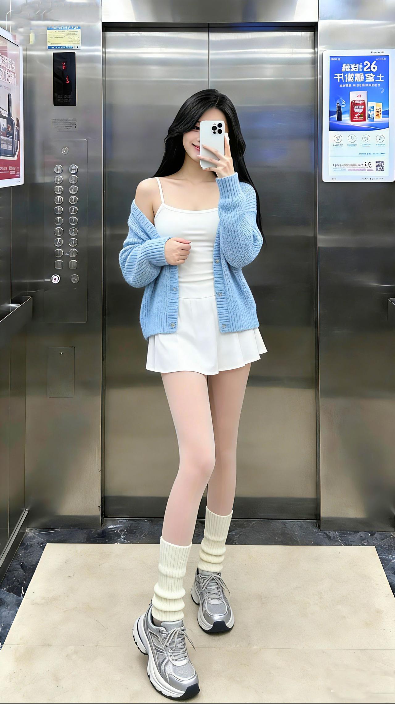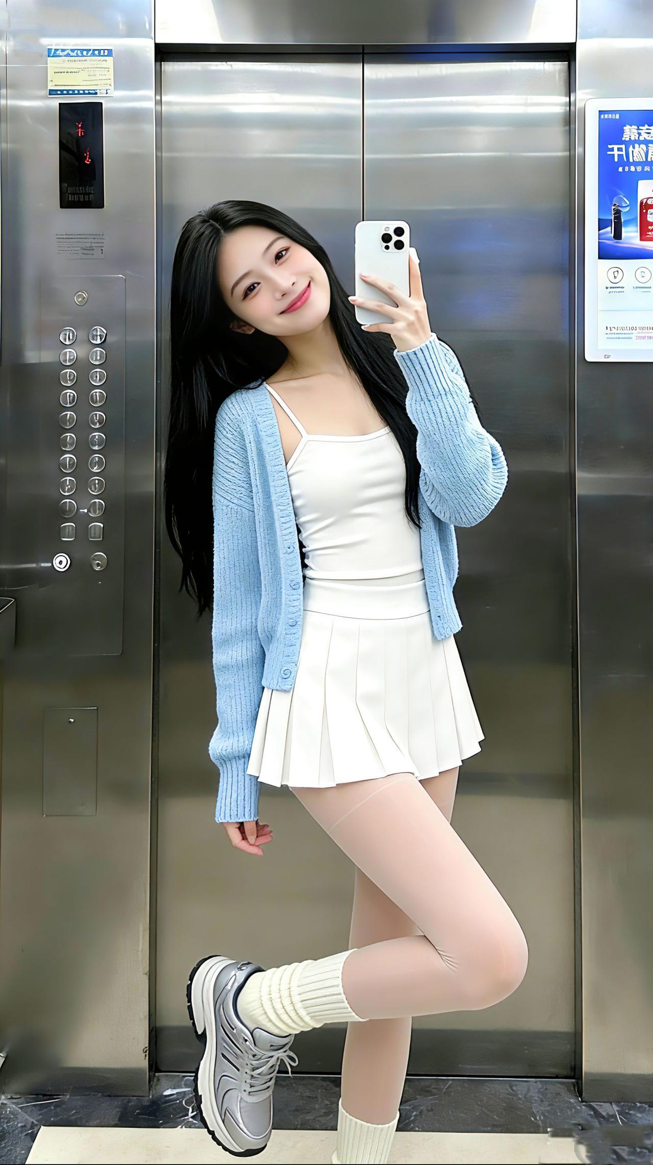 这种软萌甜飒风你们爱了吗?电梯间里,浅蓝开衫裹着软乎乎的松弛,白吊带裙一摆又添了