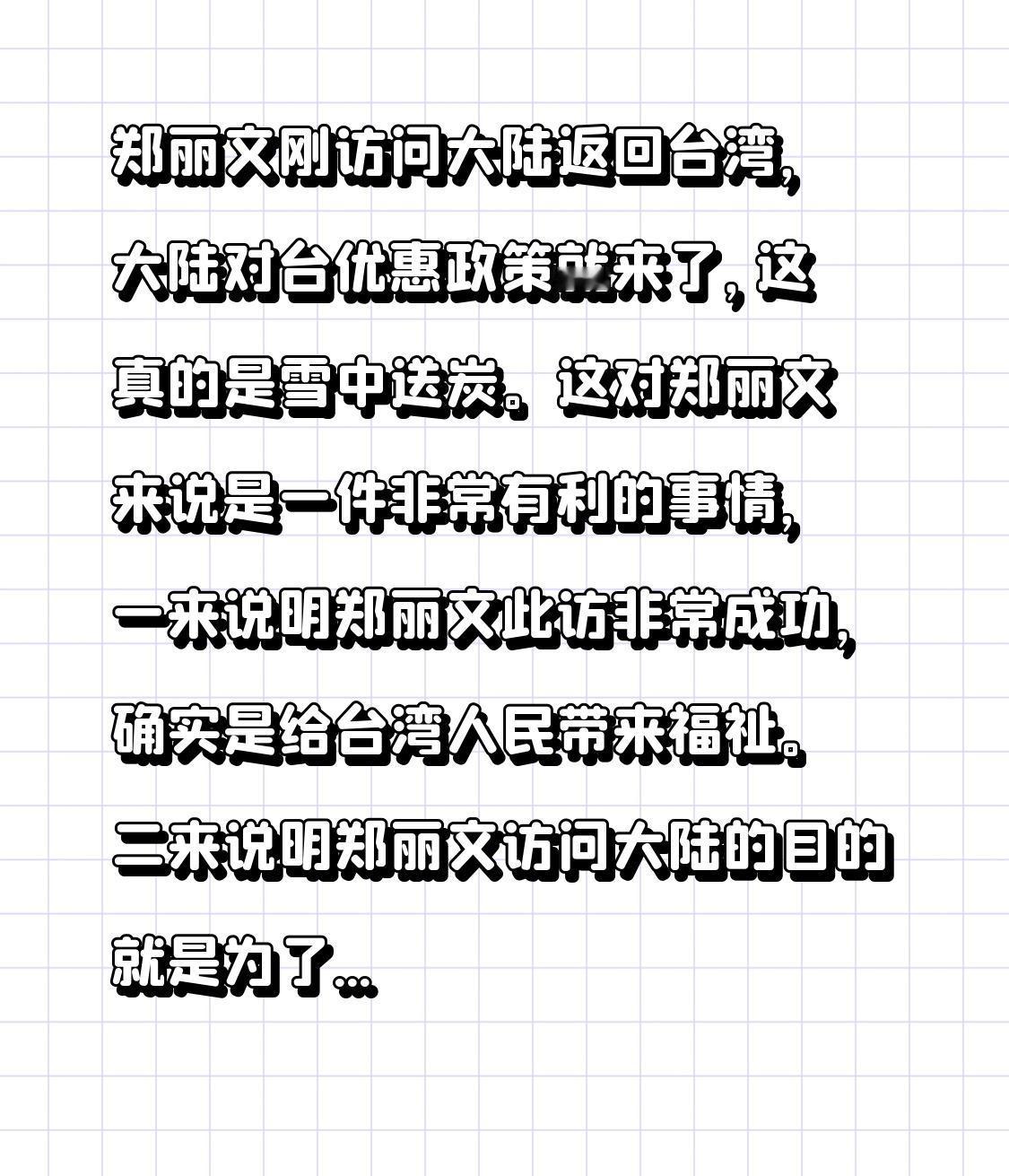 郑丽文刚访问大陆刚返回台湾,大陆对台优惠政策就来了,这真的是雪中送炭。这对郑丽文来说是一件非常有利的事情,一来说明郑丽文此访非常成功,确实是给台湾人民带来福祉。二来说明郑丽文访问大陆的目的是成功的,给台湾人民谋福祉,收获多多,打破了一些人疑虑打压。三来增强了两岸人民的认知,同时提高了郑丽文女士在台湾的声誉。为2028大选增加选情。