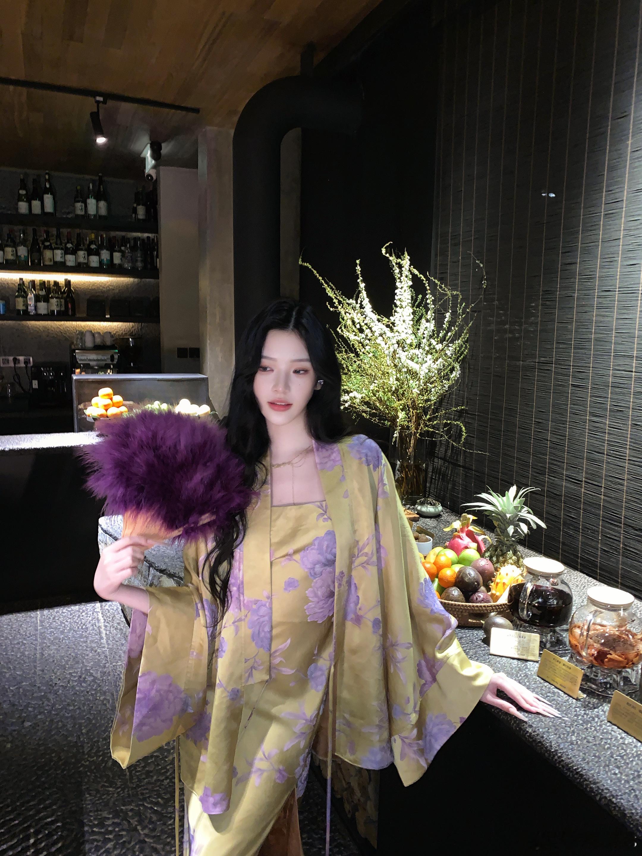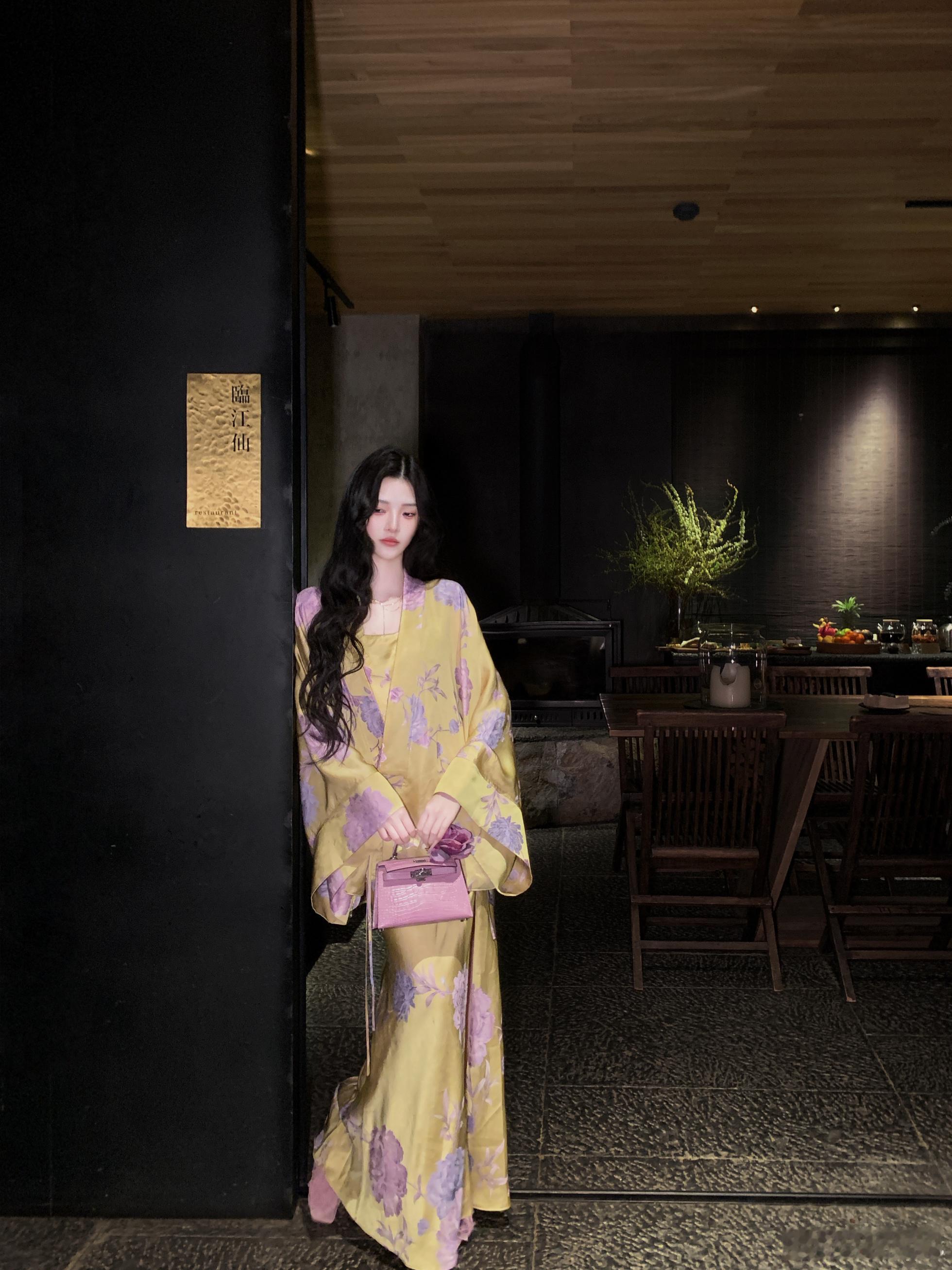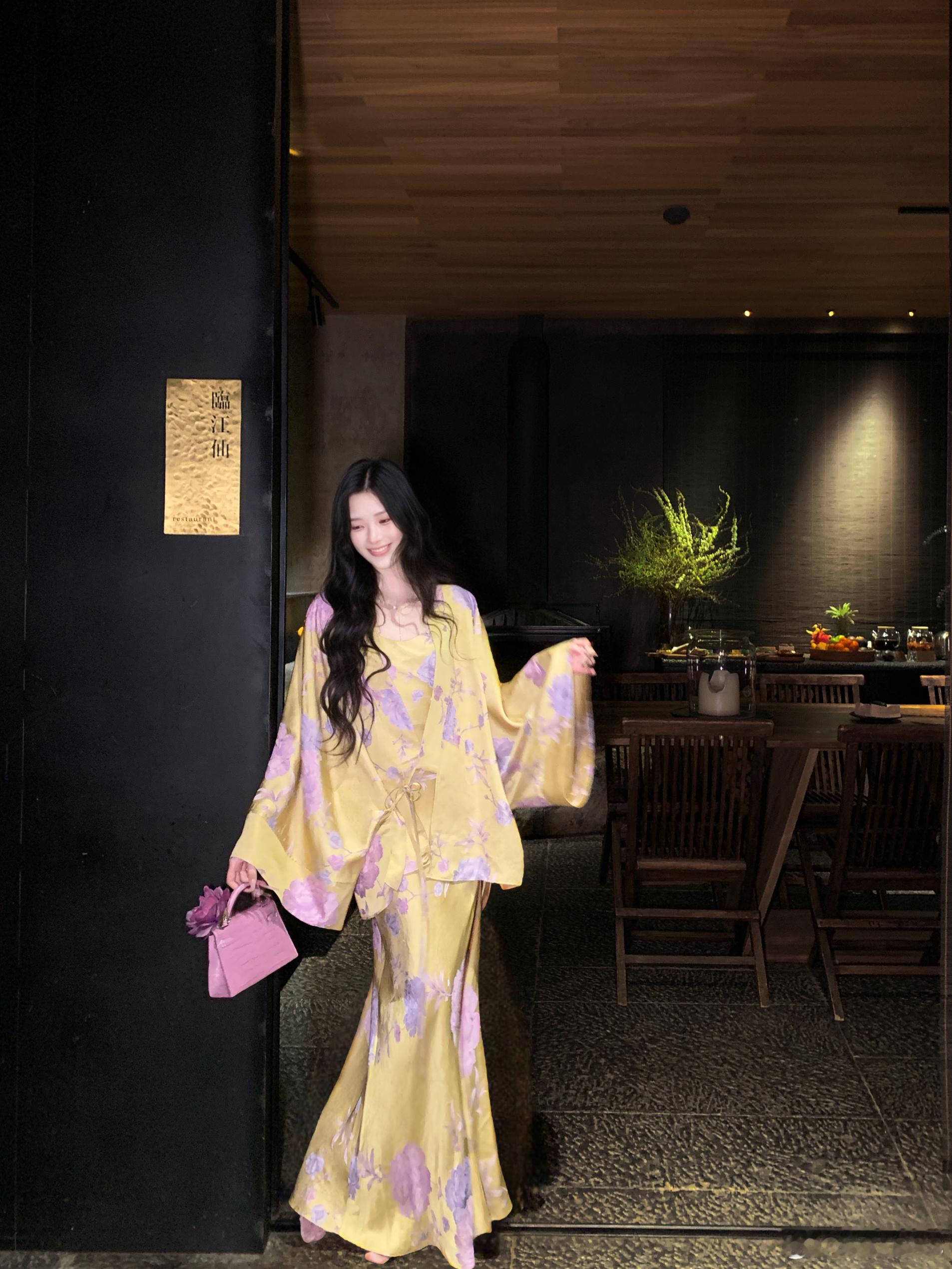 𝑴𝑶𝑺𝑺 𝟒.𝟏𝟓/𝟐𝟎:𝟎𝟎𝒑𝒎【堇色向晚】🪻🪻原创新中式真丝连衣裙+外套+马甲套装外套采用新中式改良开襟设计,弱化身材线条,打造慵懒随性的松弛感,对各种身材包容性极好👍马甲宽边交叠式挂脖领设计,巧妙修饰肩颈线条,拉长颈部比例,尽显温婉灵动的东方韵味🪭裙身以姜黄色为底,晕染出柔雾感紫调花卉纹样,从腰侧到裙摆错落铺陈,行走间自带流动的诗意👏新中式