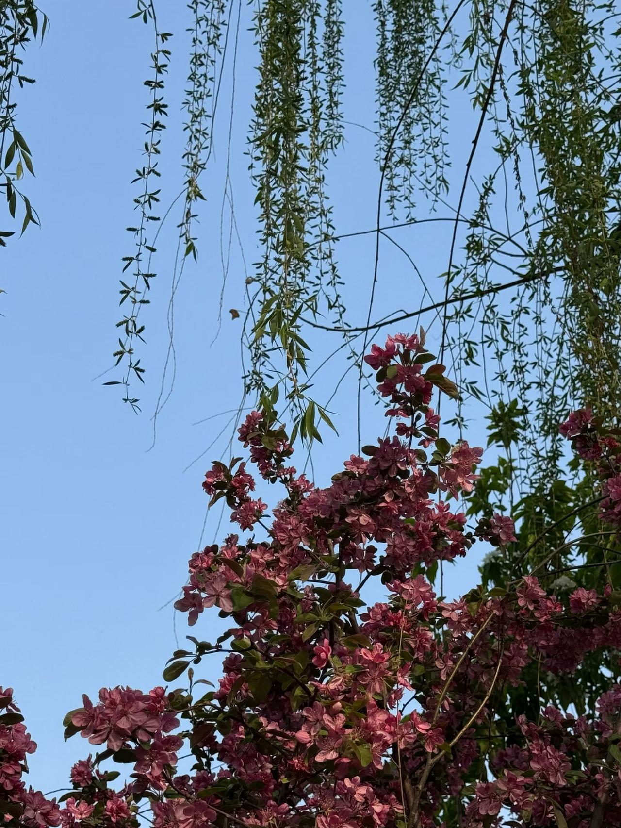 今天风很软风儿微微凉,春天把所有好看的花都搬出来了。路边的海棠开得热热闹闹,粉白粉白的,风一吹就往下飘花瓣。桃花还没谢透,梨花又紧跟着开了,一树树白得干净透亮。