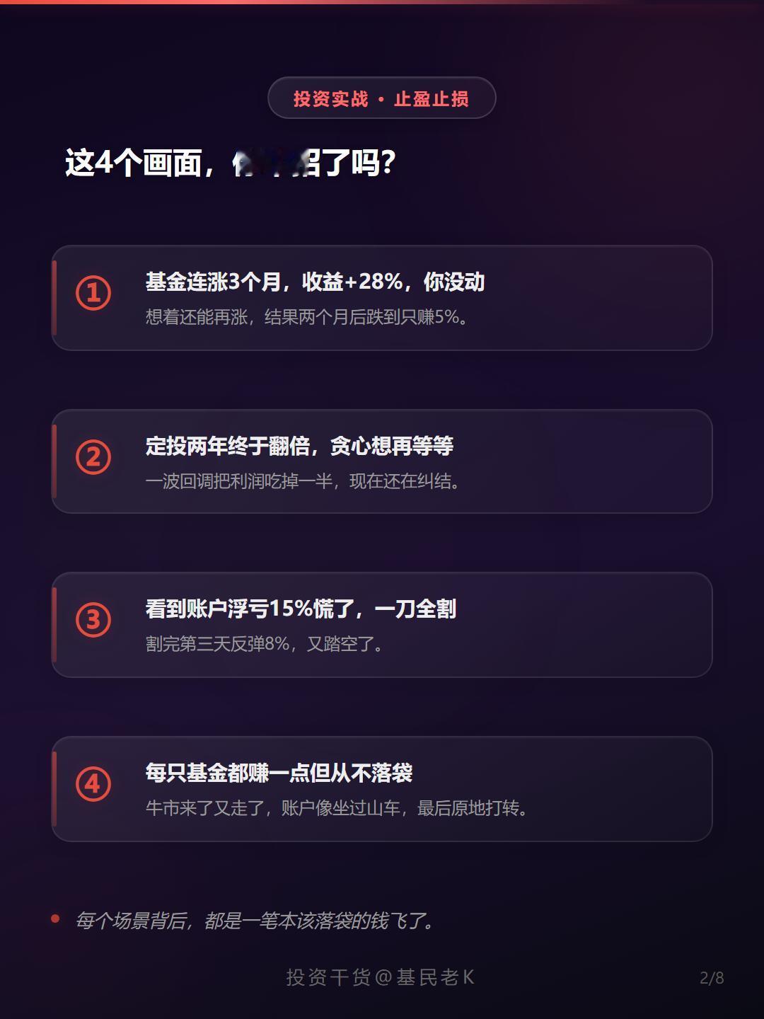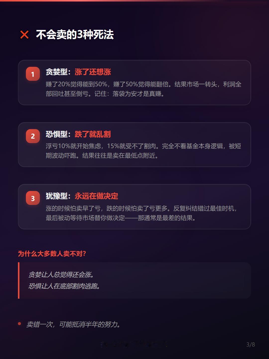 1⃣ 贪婪型:涨了还想涨 — 赚20%觉得能到50%,到了50%想翻倍。结果市场一转头,利润全部回吐甚至倒亏。记住:落袋为安才是真赚。