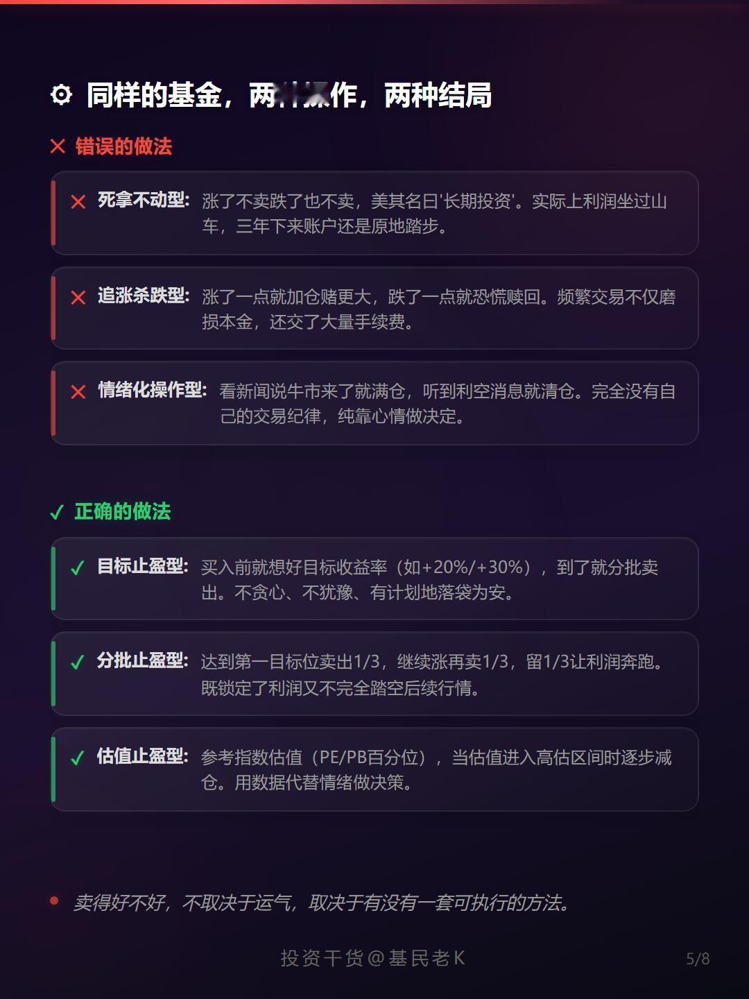 ✔ 会买的是徒弟,会卖的才是师傅 | ✔ 有纪律的止盈比死拿多赚近一倍(完整周期) | ✔ 贪婪是盈利最大的敌人:涨了就要有计划地卖 | ✔ 三套策略选其一:目标收益率 / 估值百分位 / 最大回撤 | ✔ 卖出不是认输,而是完成一个完整的投资周期。
