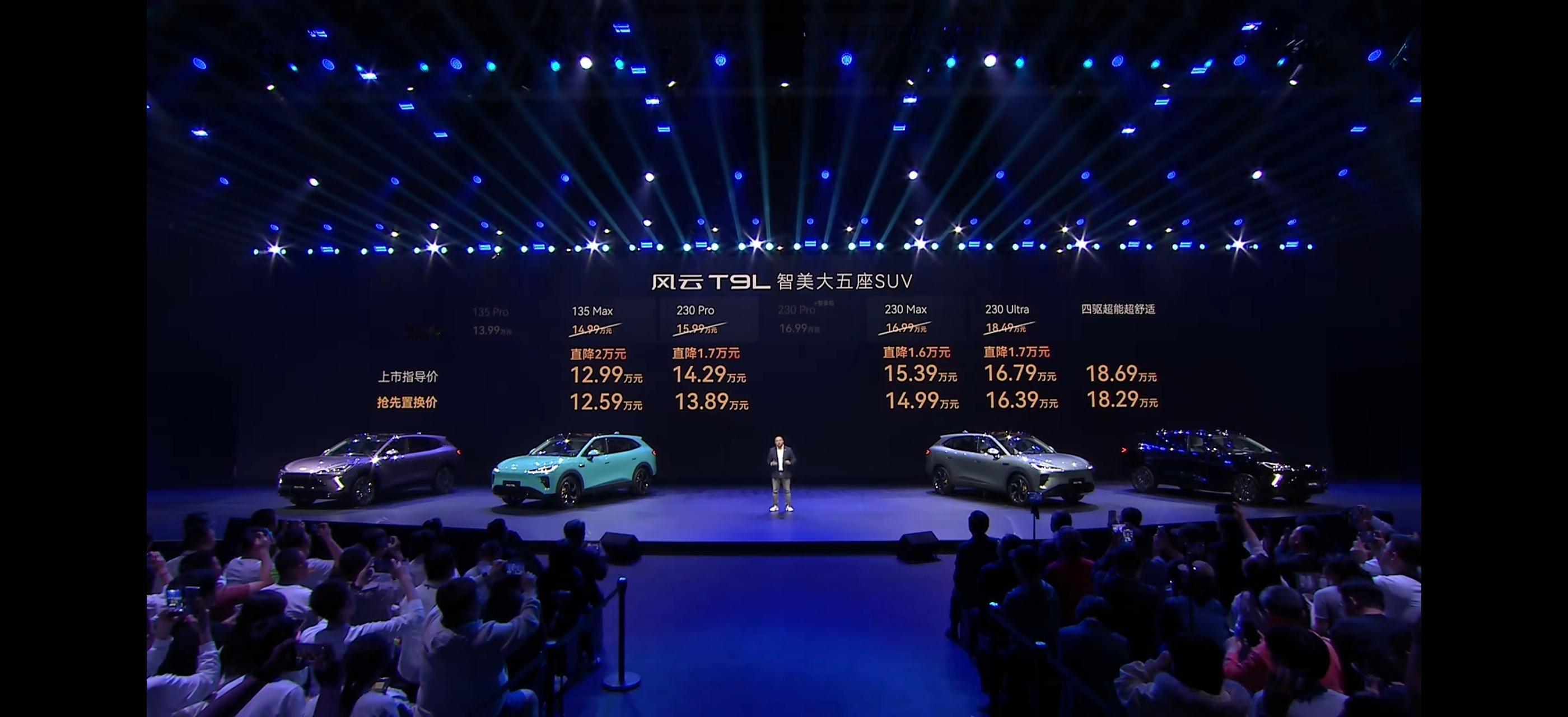 风云T9L价格出来了!分别有135Pro、135Max、230 Pro、230 Max、230 Ultra五个配置。上市12.99万起,置换最低12.59万。还有焕新礼、智联礼等七重好礼,性价比是真不错!智美大五座风云T9L全球上市 风云T9L上市12.99万元起