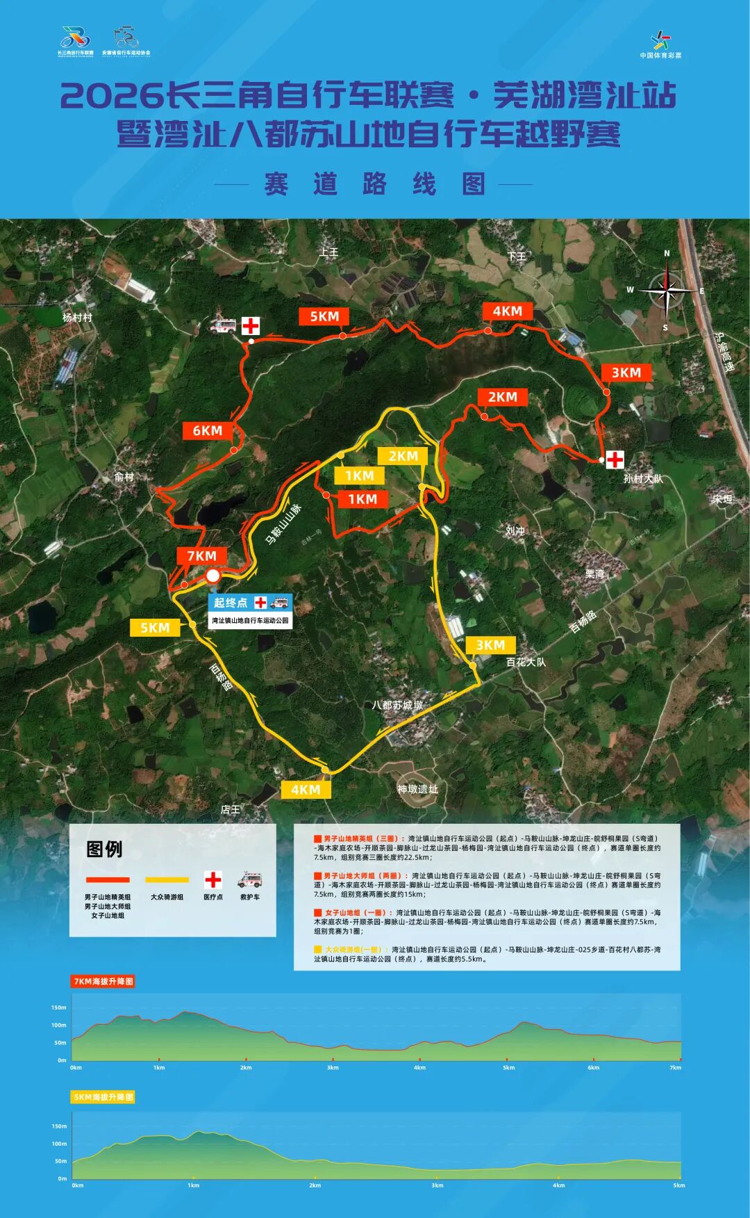 “一城山水半城园,百里画廊入眼来”,芜湖湾沚已连续多年成功举办高水平体育赛事,今年再度承办长三角自行车联赛年度首站,赛道全面优化、焕新升级。竞赛组别以湾沚镇山地自行车运动公园为起终点,单圈约7.5公里,穿越马鞍山山脉、坤龙山庄、皖舒桐果园、海木家庭农场、开顺茶园、脚脉山、过龙山茶园、杨梅园等地标。男子精英组三圈约22.5公里,大师组两圈约15公里,女子组一圈约7.5公里。大众骑游组则独辟5.5公里体验路线,将深入拥有六百多年历史的八都苏古村落。