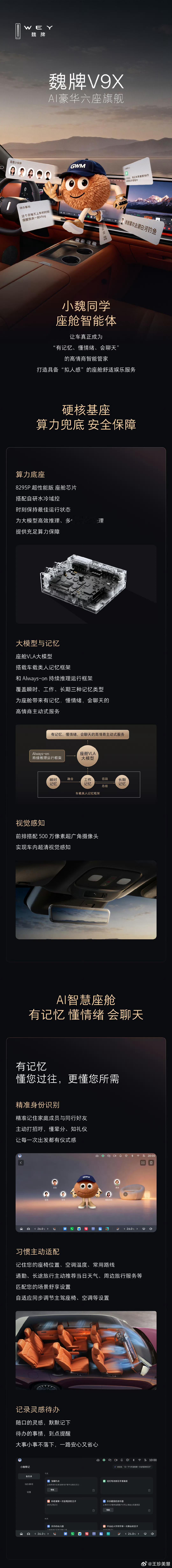 魏牌V9X的“原生AI智能体”,就是把“认人识人”当成了起点,而不是终点。它不仅能精准识别车里的每一个人,还能记住每个人的偏好,甚至能理解人与人之间的关系。它会察言观色,感知你的状态,然后完成适配。比如,它知道主驾是爸爸,副驾是妈妈,后排是孩子,当爸爸说“有点热”的时候,它会智能判断是给全家降温,还是只给后排的孩子调整风向。