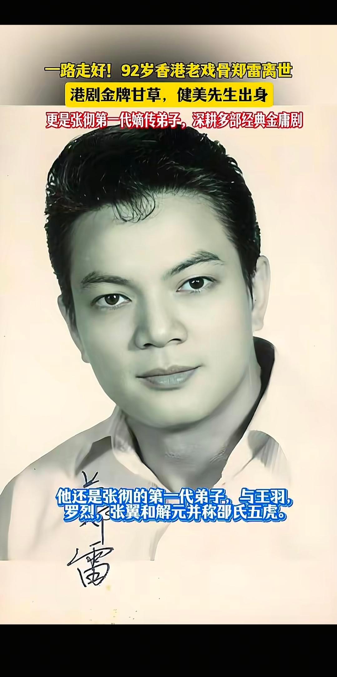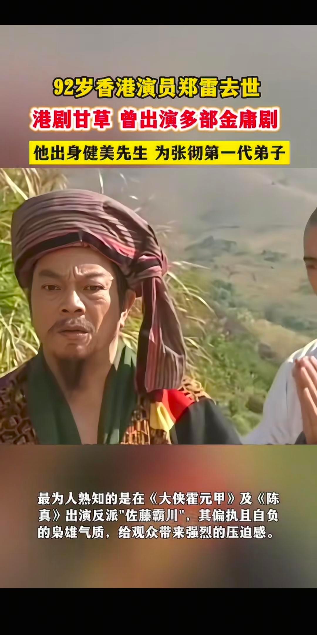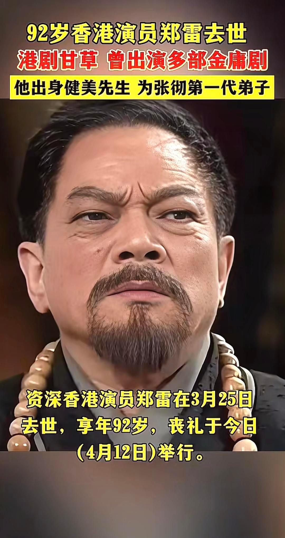 92岁香港演员郑雷去世。 热点 郑雷