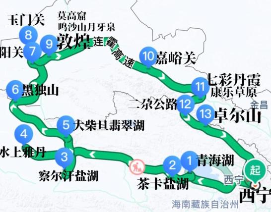 3. 青甘大环线(西宁-青海湖-翡翠湖-敦煌-张掖):全程约2700公里,浓缩西北极致风光。7月青海湖油菜花海与湛蓝湖面交相辉映,大柴旦翡翠湖如薄荷绿宝石,水上雅丹尽显科幻感,张掖丹霞色彩斑斓。沿途既有湖泊的澄澈,也有戈壁的辽阔,夏季气候舒适,是摄影爱好者的天堂,记得提前预订住宿与莫高窟门票。