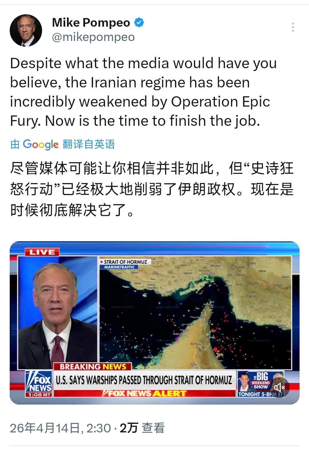 美国前国务卿蓬佩奥今天(北京时间4月14日)写道:“尽管媒体可能让你相信并非如此,但‘史诗狂怒行动’已经极大地削弱了伊朗政权。现在是时候彻底解决它了。”