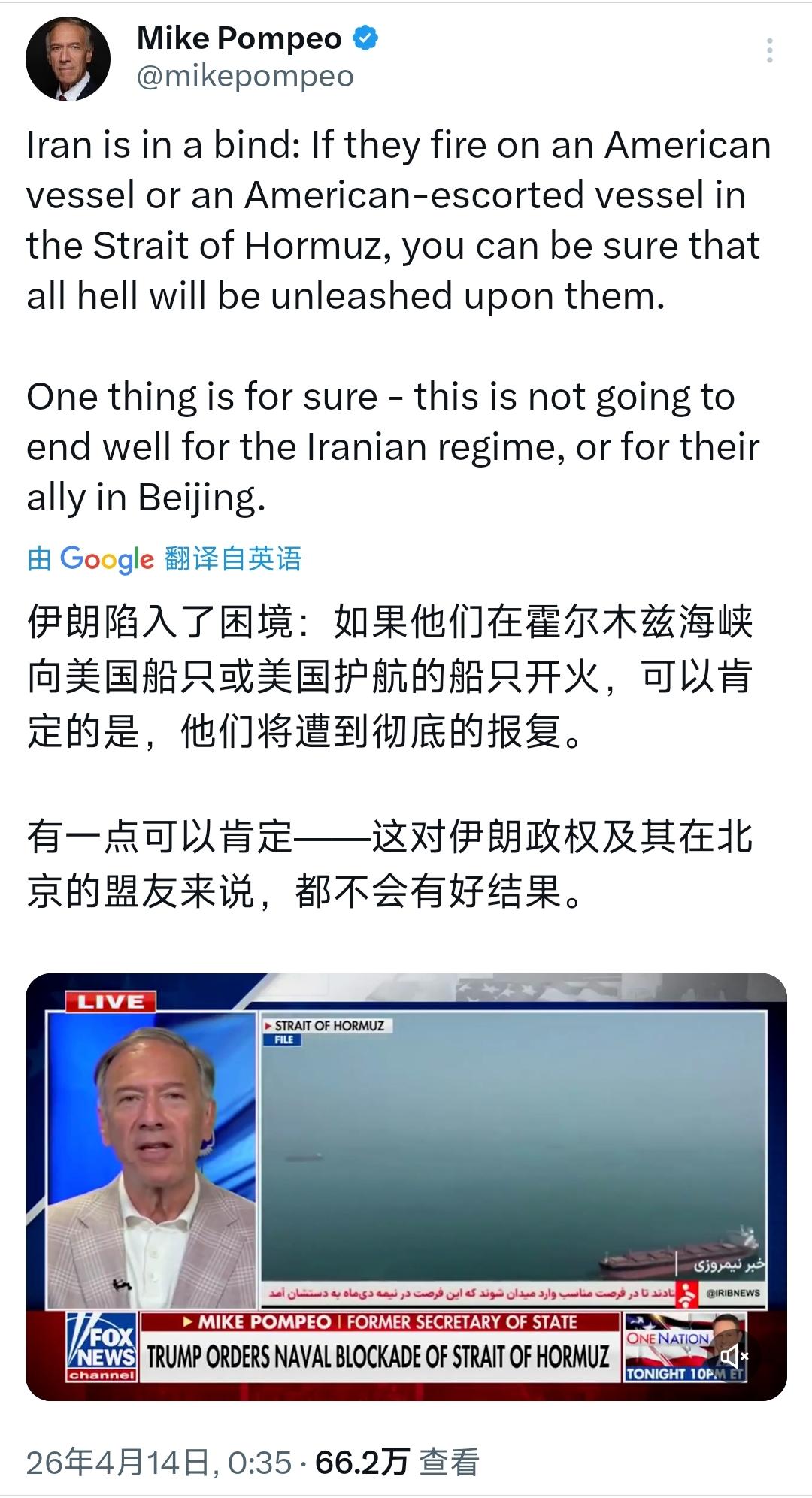 美国前国务卿蓬佩奥今天(北京时间4月14)叫嚣道:“伊朗陷入了困境:如果他们在霍