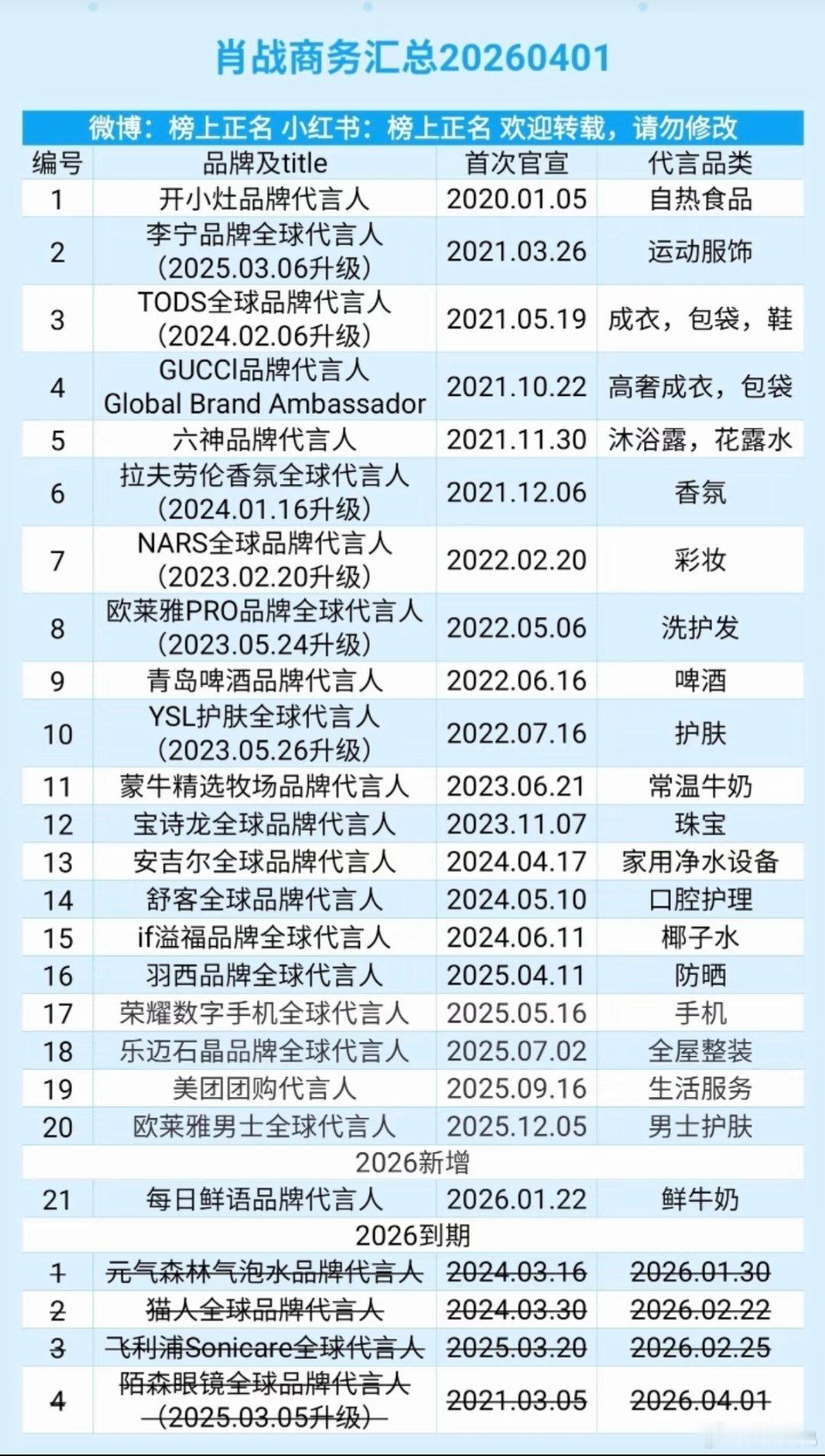 毅可能涉及到与公司合同续约问题,开年掉代言也是情理之中吧;战2025年底代言25个,现代言21个感觉《雕》《藏海传 》《得闲》等剧对此代言加持不大;王一博则代言一直30个左右,连续7年均保持top1,且代言质量数量均很高;千玺代言数量也一直15个左右很稳;张凌赫代言从去年的17个,上升至20个。现将自己看到的两个代言数量汇总图片粘贴出来,仅供大家参考吃瓜。