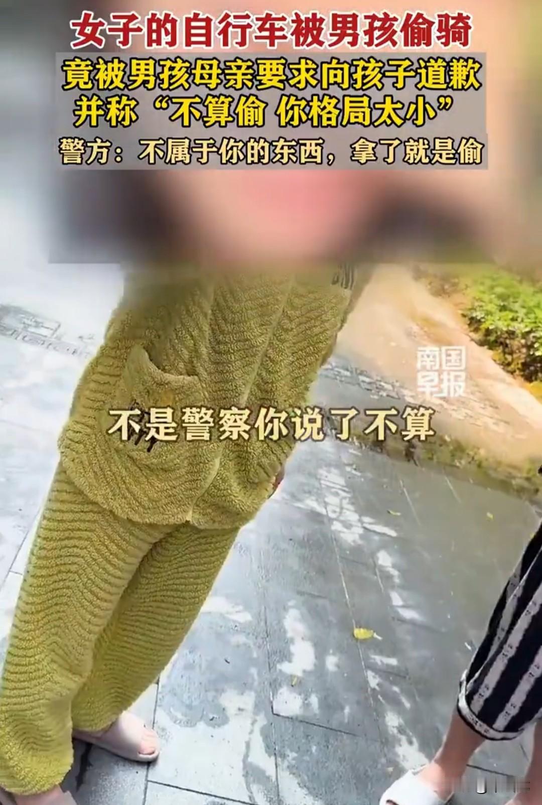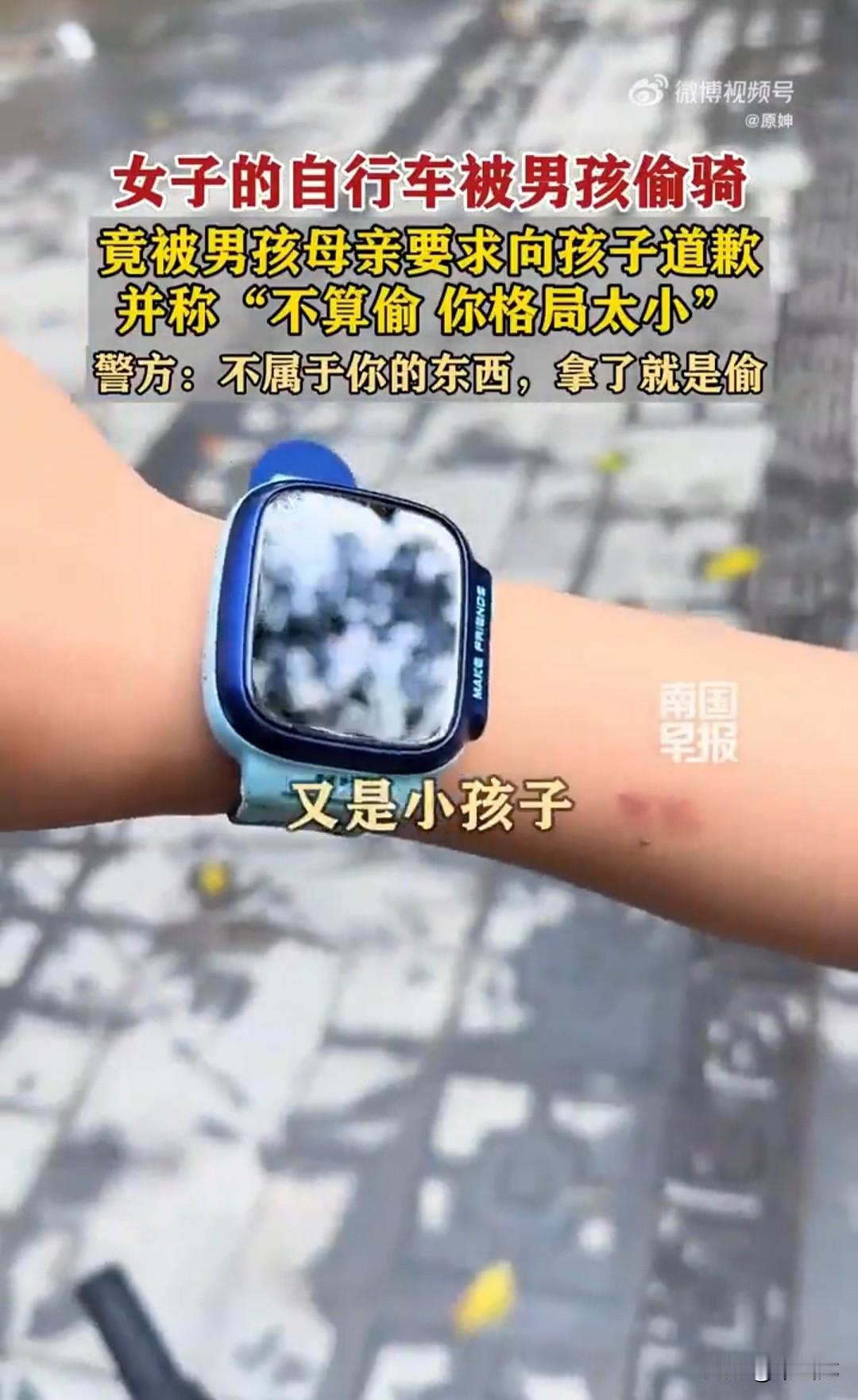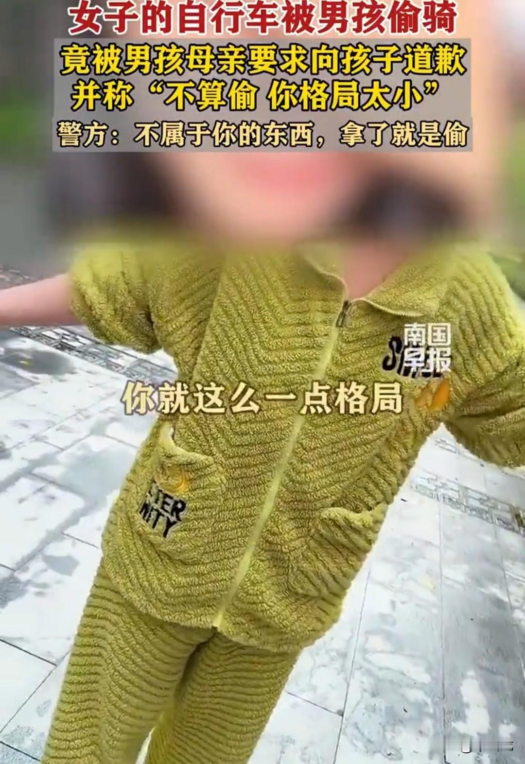 网友联系小孩母亲,没想到小孩母亲来了后,对网友用“偷车”一词形容小孩的行为极度不满,说网友是诽谤,要求网友给小孩道歉,还说什么“都是邻居,又是小孩子,你格局太小。”