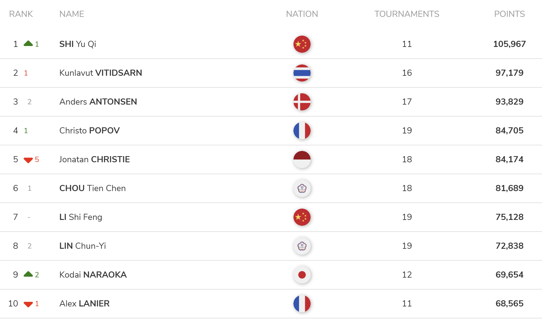 国羽3项世界第一 世界羽联2026年第16周世界排名公布,国羽方面:男单:石宇奇第一,李诗沣第七女单:王祉怡第二,陈雨菲第四,韩悦第五男双:梁伟铿/王昶组合第五女双:刘圣书/谭宁组合第一,贾一凡/张殊贤第四,李怡婧/罗徐敏第八混双:冯彦哲/黄东萍第一、蒋振邦/魏雅欣第二、郭新娃/陈芳卉第六