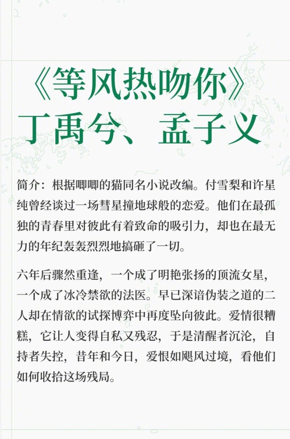 电视剧《等风热吻你》选角🍉 丁禹兮演禁欲法医,孟子义演明艳女星,单看人设都挺贴脸的,但这俩站一块…总觉得没啥CP感
