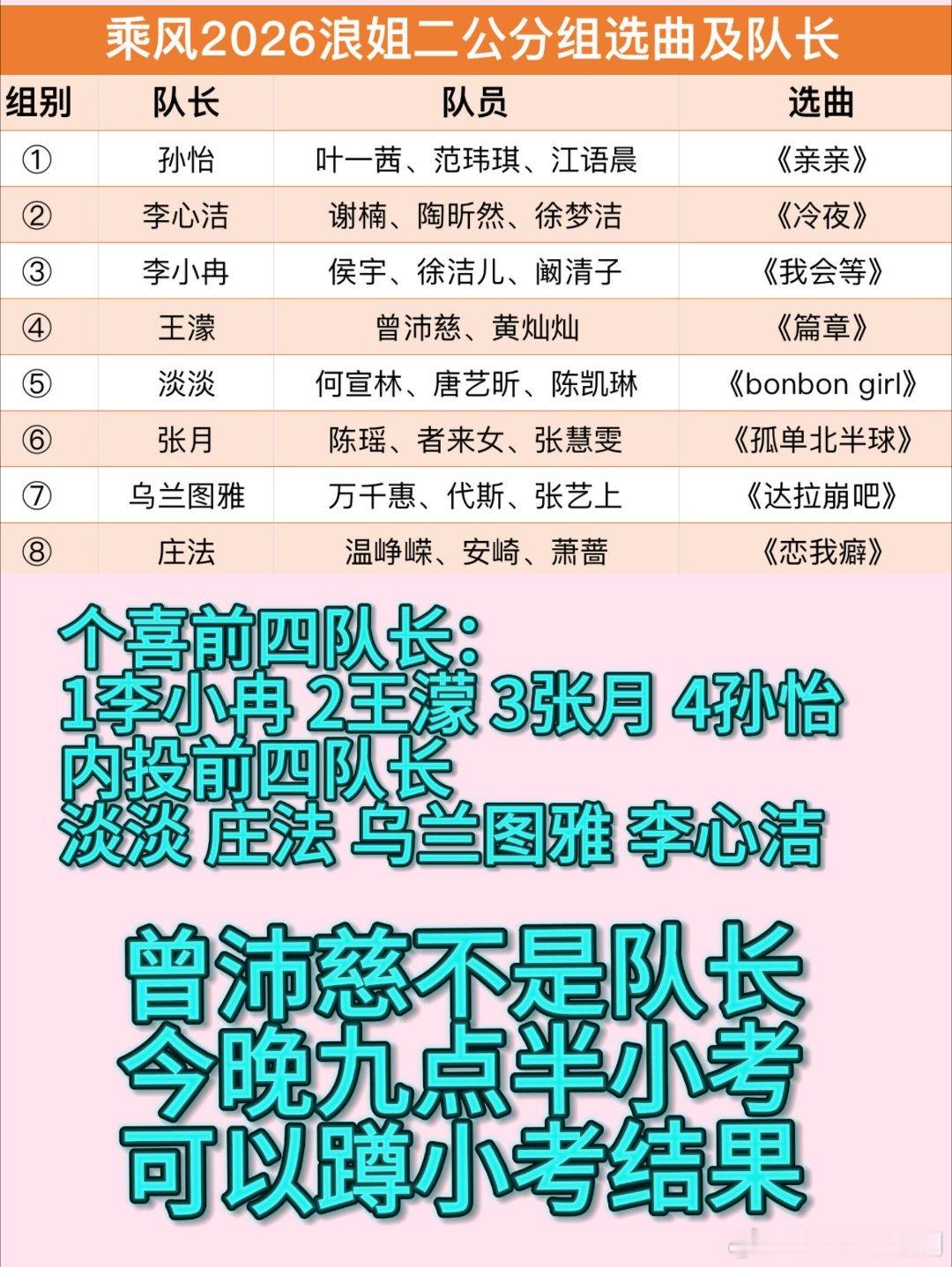 乘风2026|浪姐二公分组选曲汇总浪姐二公今晚小考,到时候又是一堆乐子姐姐们加油呀!