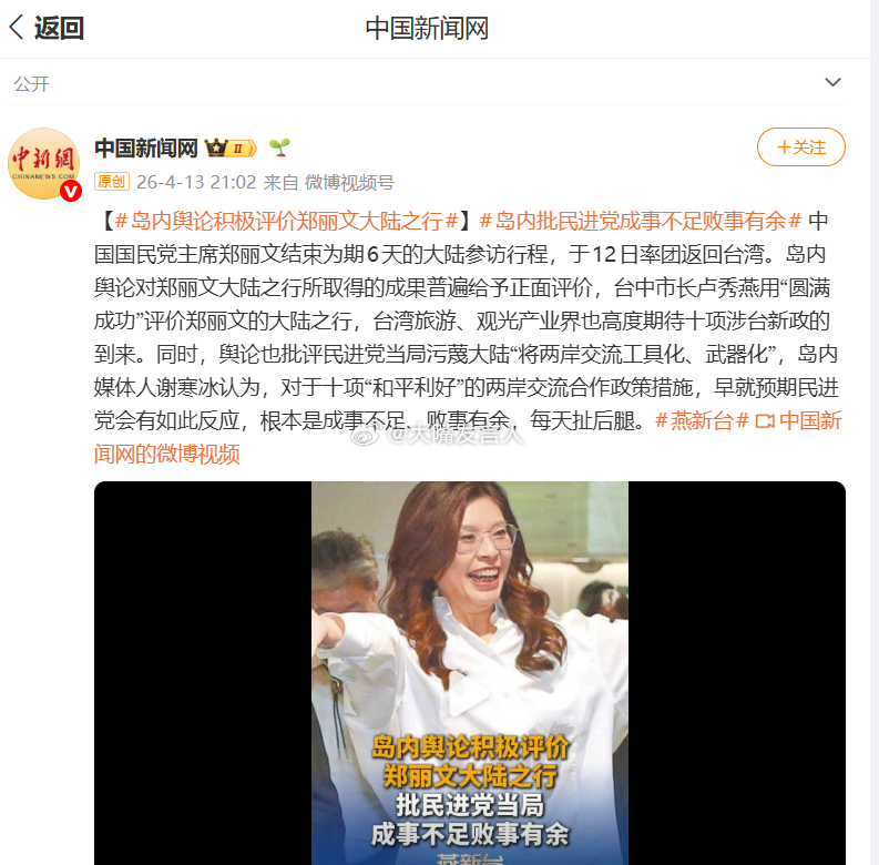 岛内舆论积极评价郑丽文大陆之行 ,岛内批民进党成事不足败事有余 ,热点观点