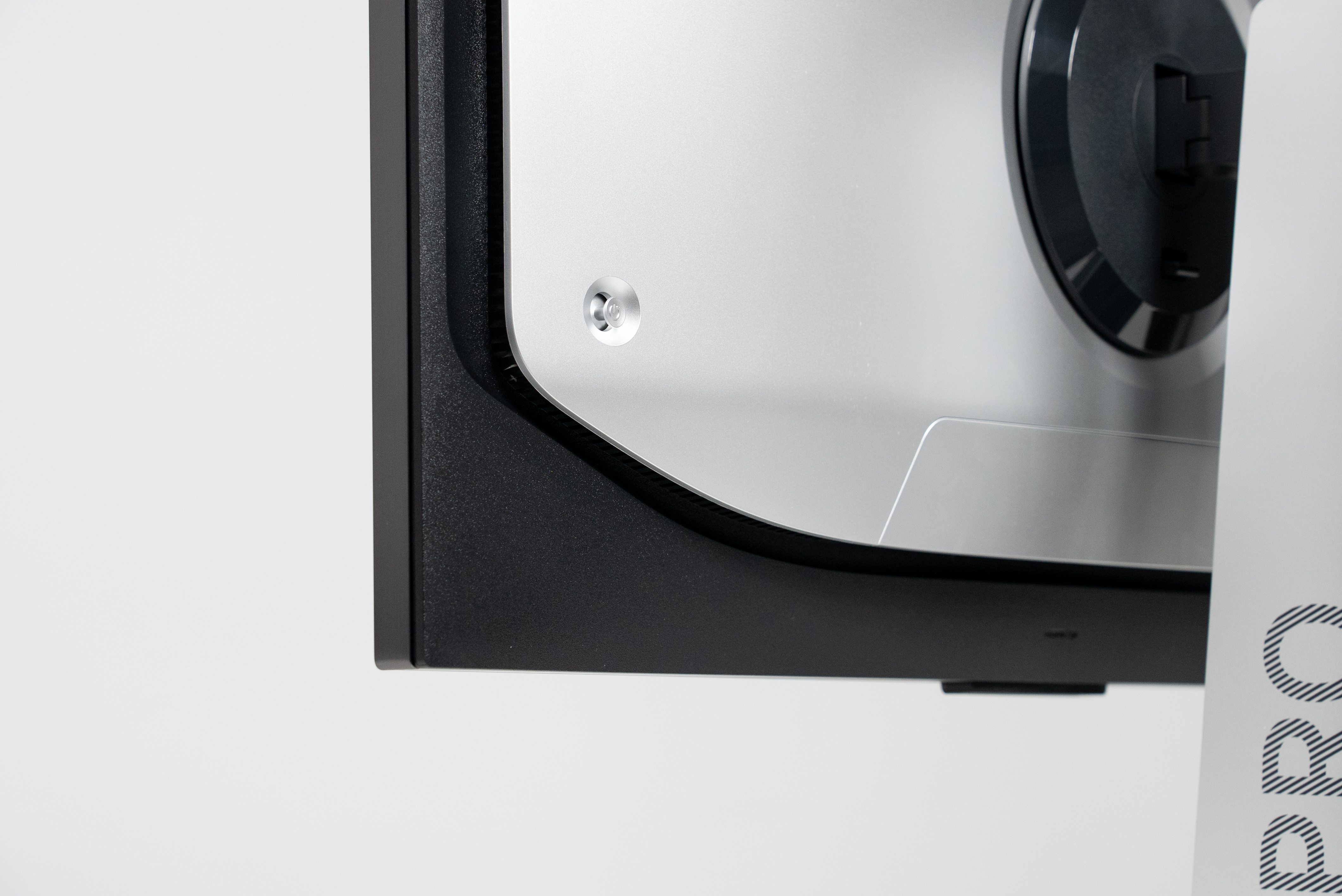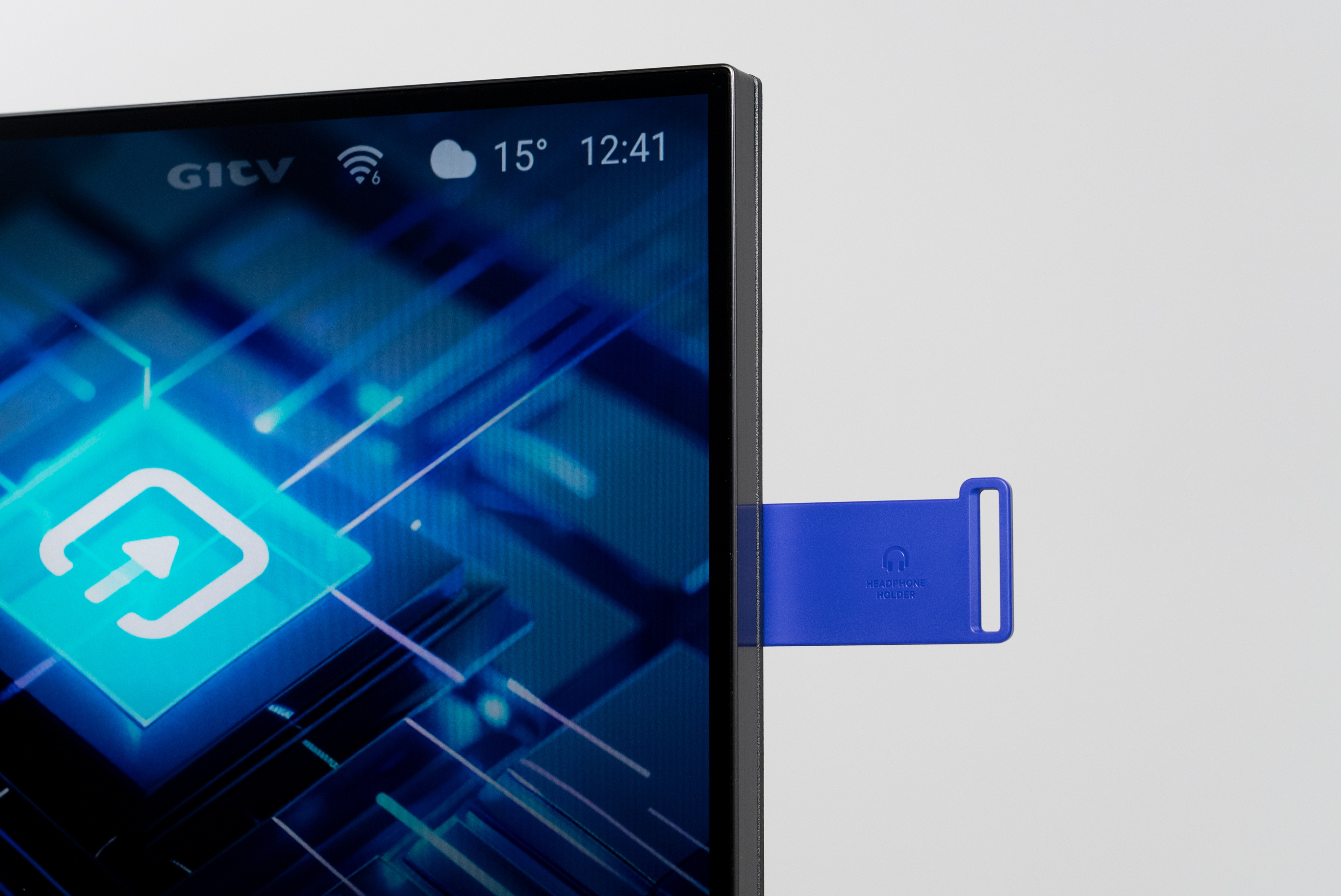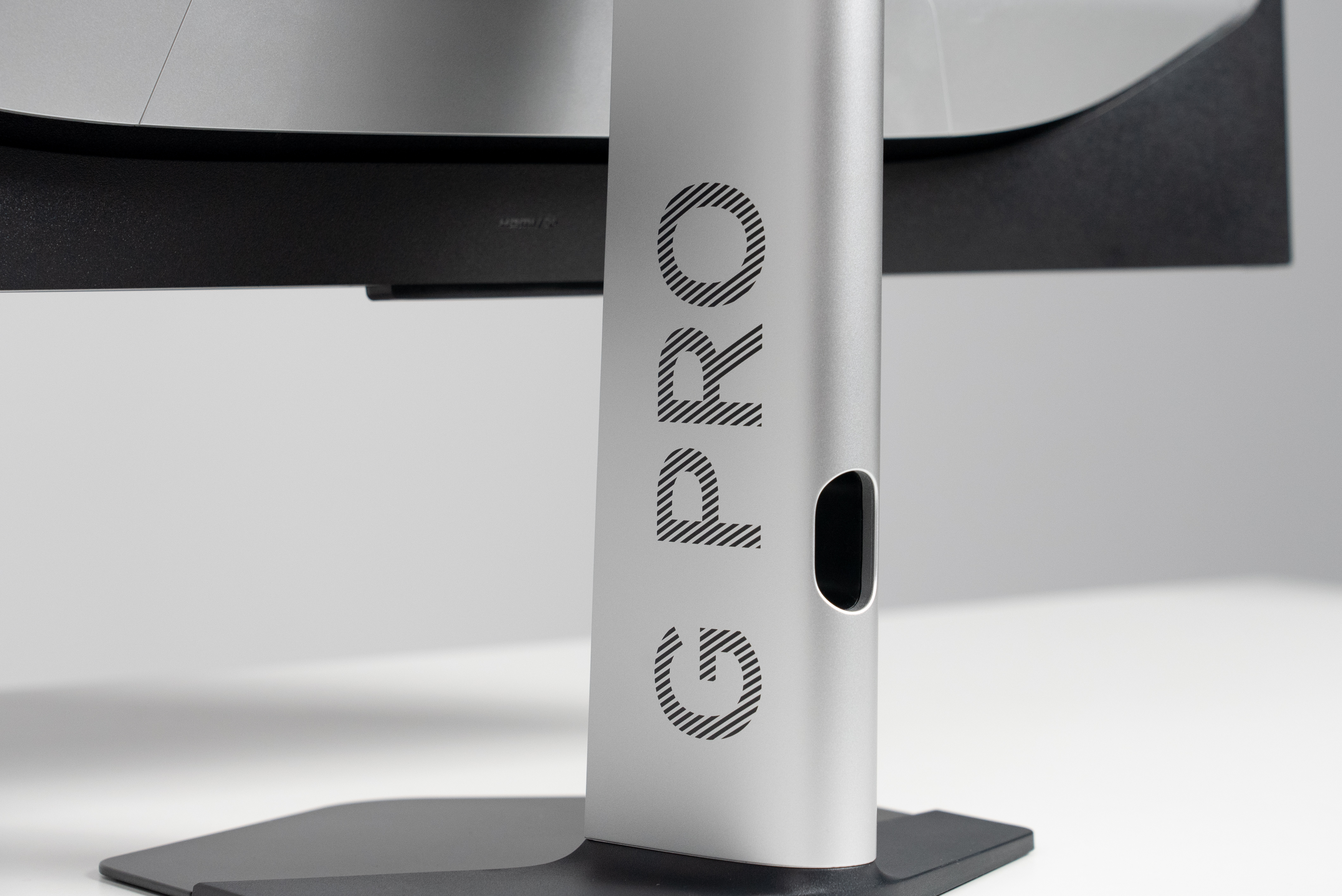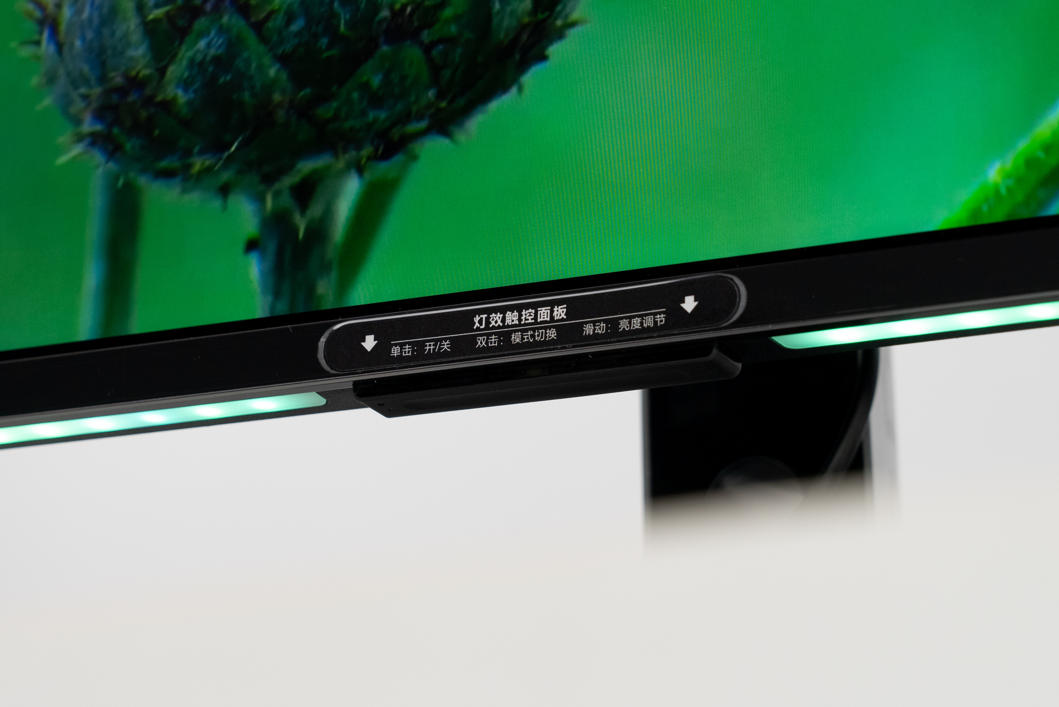 相比于上一代升级了铝合金边框,外壳变成了金属质感喷漆,质感更好了。显示器底部增加了两条对称灯带,支持声画同步,灯光效果会随画面变化。同时背面右侧还专门留了一个可抽拉的放耳机的支架