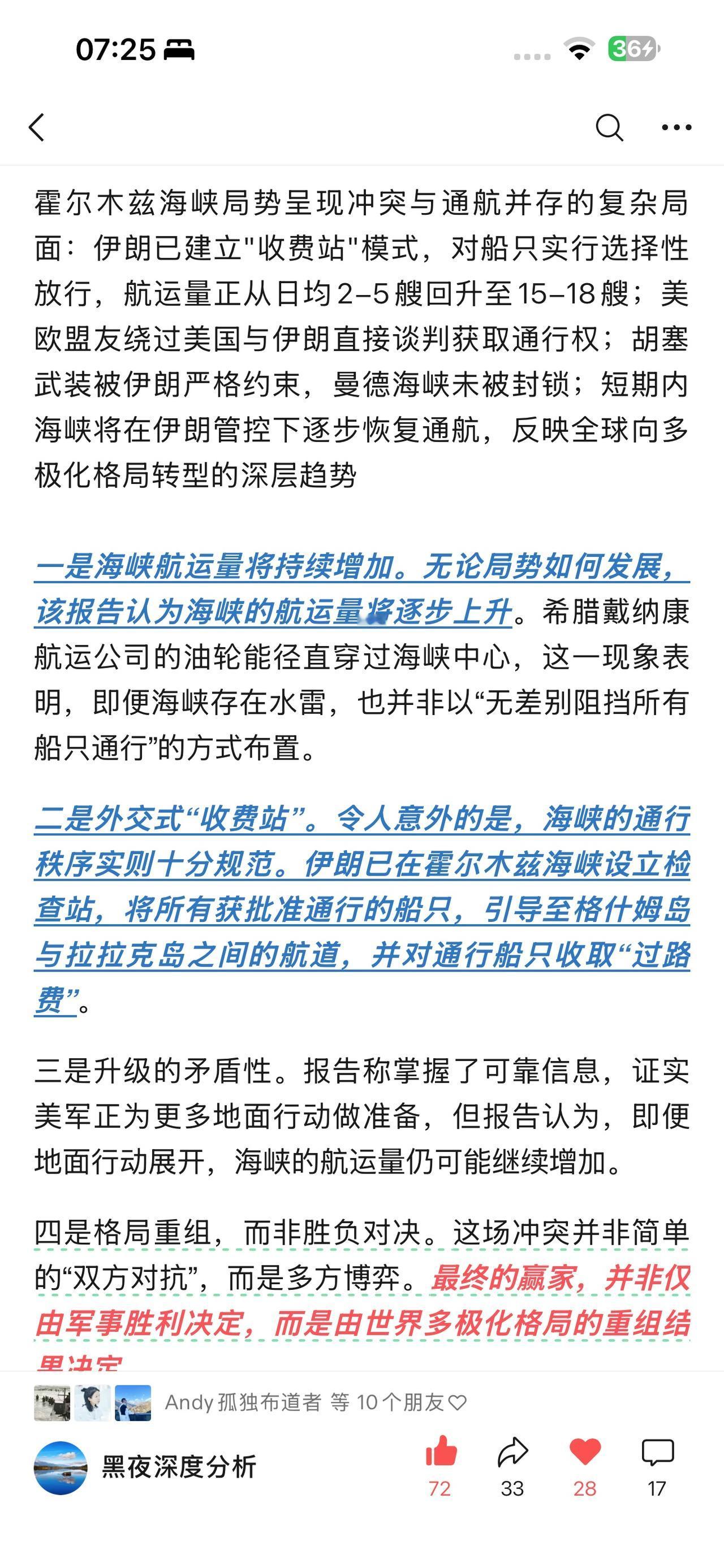 我在我的公众号 黑夜深度分析 写了霍尔木兹海峡有限度开通 美国准备认怂 你就说有