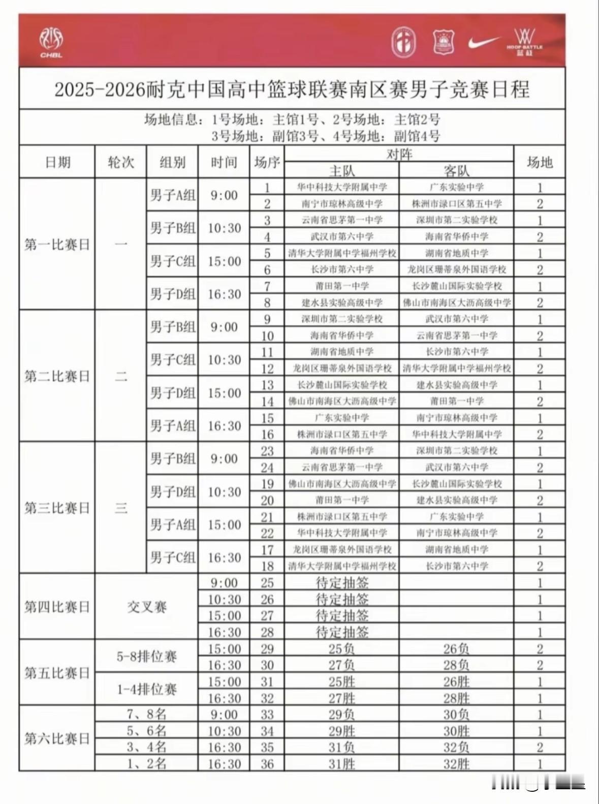2025-2026赛季耐克中国高中篮球联赛南区赛赛程如下: 男子组: ​ 报