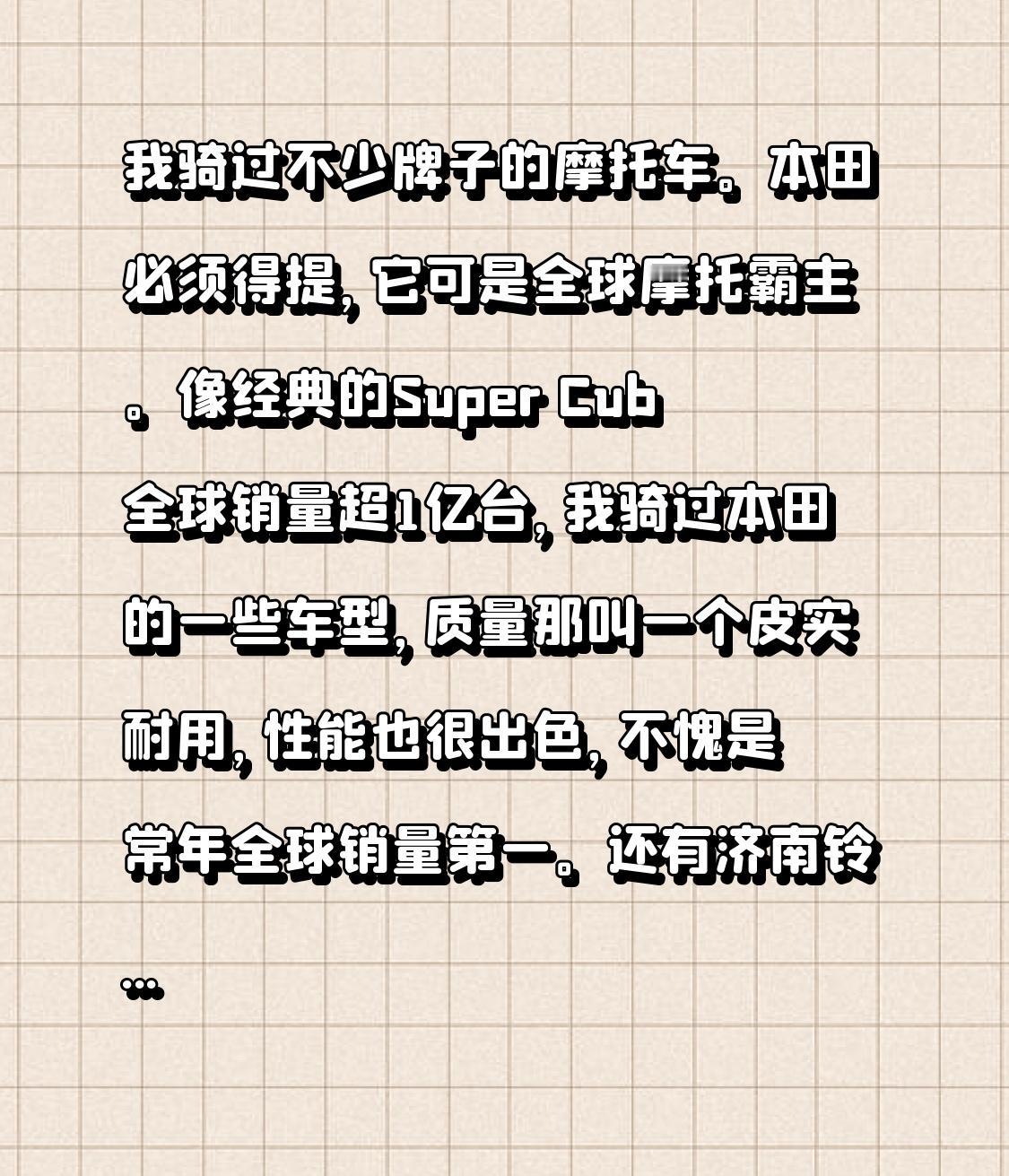我骑过不少牌子的摩托车。本田必须得提,它可是全球摩托霸主。像经典的Super Cub全球销量超1亿台,我骑过本田的一些车型,质量那叫一个皮实耐用,性能也很出色,不愧是常年全球销量第一。