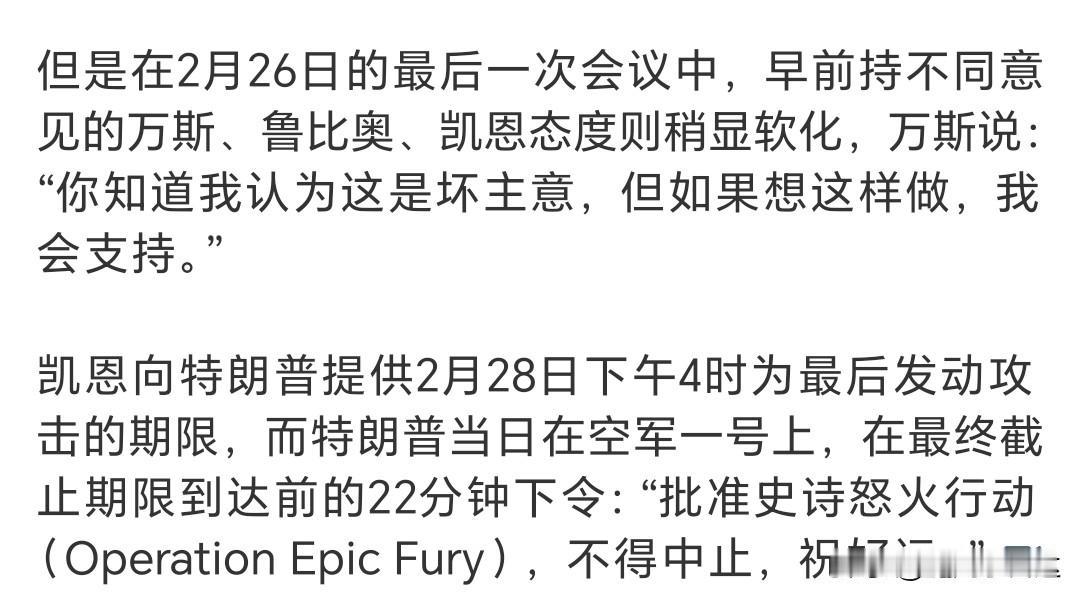 但是在2月26日最后一次会议上以上几位态度略显软化,万斯甚至说出类似保留个人意见,支持特朗普对伊行动的话!