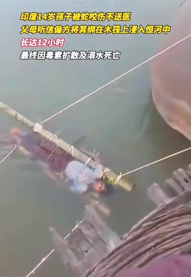 印度一名14岁男孩被烈蛇咬伤,父母不信现代医学,反而听了术士的话,把孩子绑好半泡在恒河里,说这样能“吸走蛇液”。