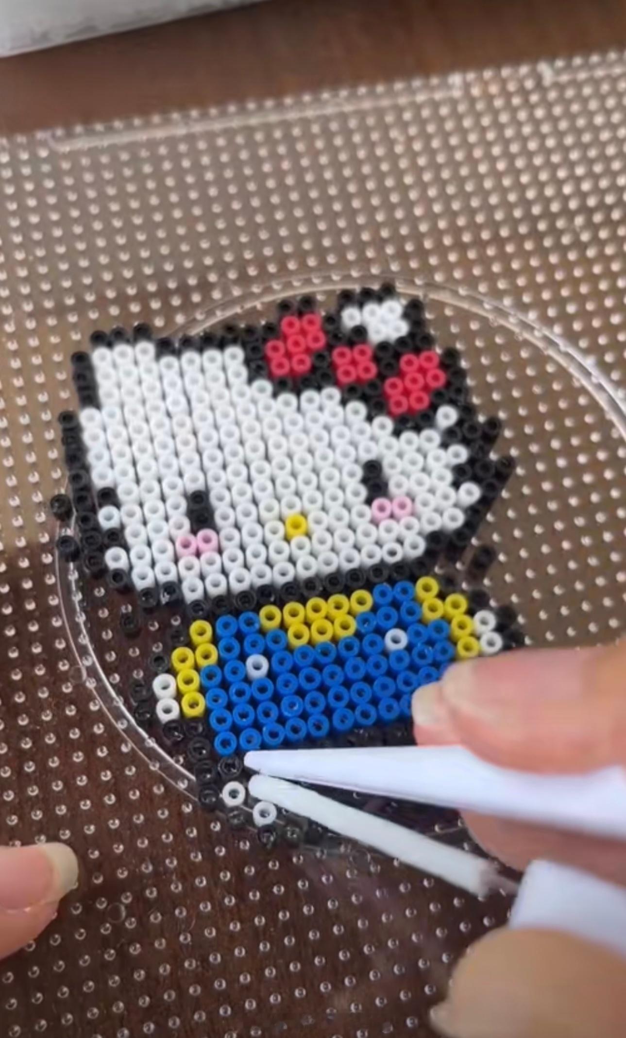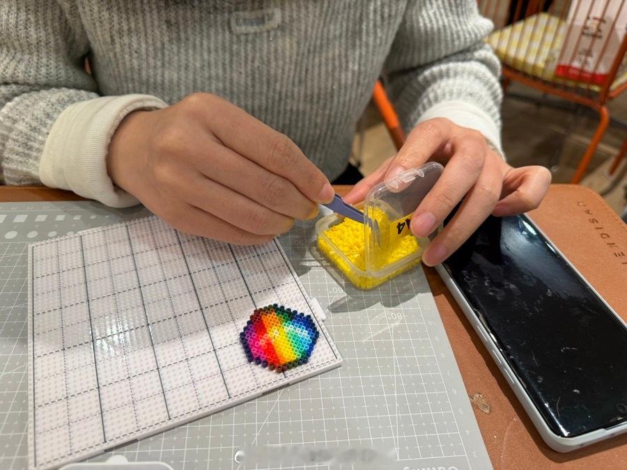 我给老年粉丝们介绍一下,啥叫拼豆。这玩意去年爆火,下半年开始,全国到处开店,年轻人很喜欢玩。 门店提供场所,还有彩色的塑料粒。你可以专注的拼像素图案,团购大概19.9-29.9每小时,你可以diy,把这些塑料粒拼成图案。拼好后,店员先拿熨斗熨烫,然后冷却成型,给你的diy做成小钥匙扣。 成本不到1块钱,这个利润非常高。但现在竞争很大,加上房租水电,其实赚不了太多钱了。