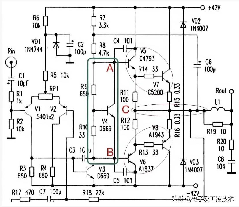 这位网友堆这两个电阻的作用是明白的。一个是上偏置电阻,一个为下偏置电阻,这种电路的组织形式能够稳定电压来消除交越失真,但他不明白的是为什么第一个电路中能做到I₂远远大于Iʙ。