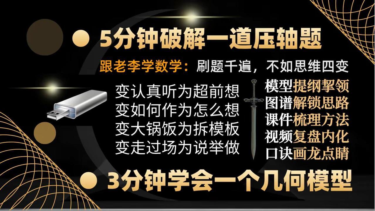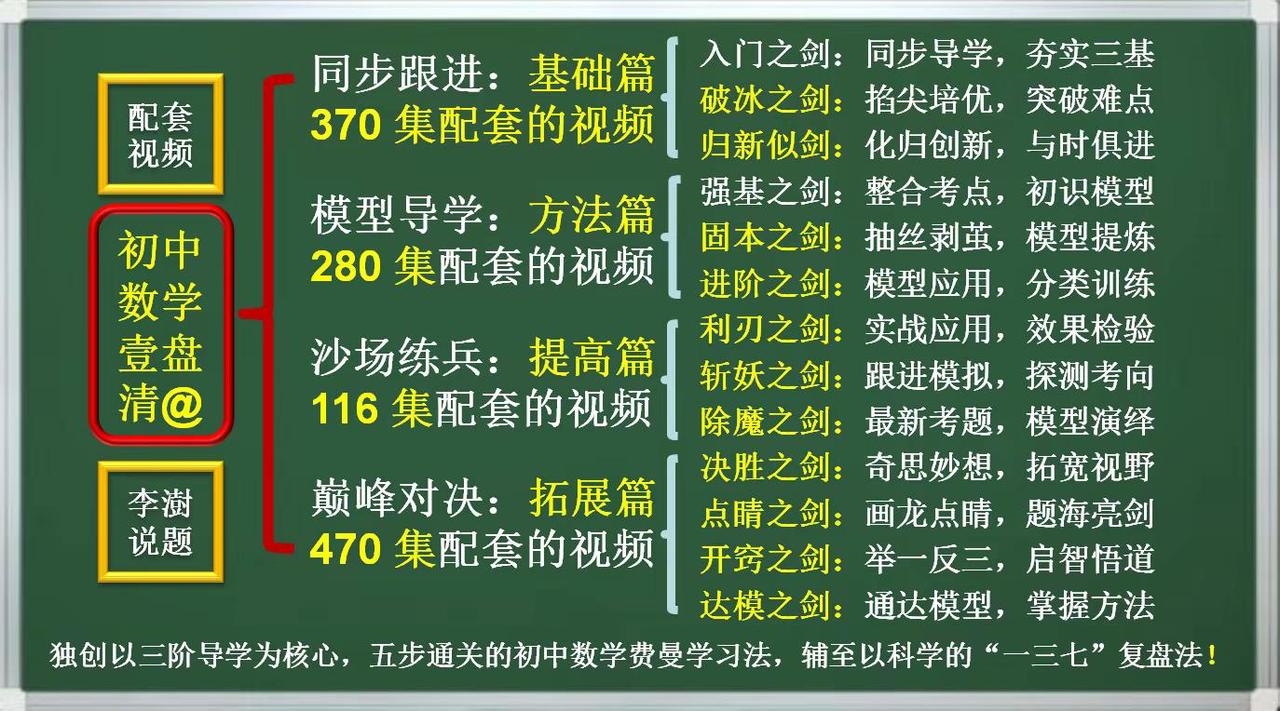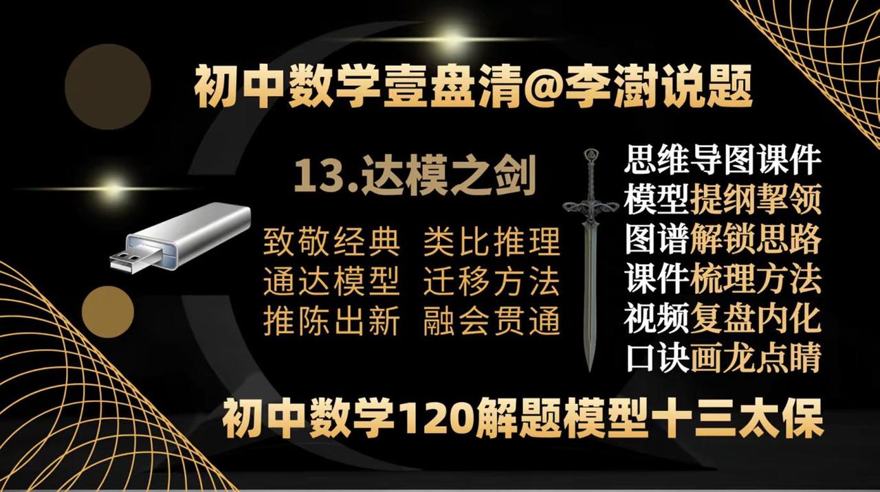 《初中数学壹盘清》第13个作品:达模之剑。《初中数学壹盘清》,原名《初中数学120解题模型三剑客》,又名《初中数学120解题模型十三太保》第13个作品《达模之剑》设计方案——视频课程已经开始创作——如何让你家里的电视机变成孩子的大屏学习机——让你的孩子在家也能享受名师的辅导——你绝对想不到,一个小小的优盘帮你做到了—— 如何让你家里的电视机变成孩子的大屏学习机——让你的孩子在家也能享受名师的辅导——你绝对想不到,一个小小的优盘帮你做到了——把脉新中考,迎接新挑战,与中考改革无缝衔接的《初中数学壹盘清》5.0版全新上线,专注于通过全面、系统、科学、专业的训练,提高孩子的思维能力。——初中数学 中考数学初中数学解题技巧 中考数学压轴题 如何让你家里的电视机变成孩子的大屏学习机。让你的孩子在家也能享受名师的辅导?你绝对想不到,一个小小的优盘帮你做到了—— 把脉新中考,迎接新挑战,与中考改革无缝衔接的《初中数学壹盘清》5.0版全新上线,专注于通过全面、系统、科学、专业的思维训练,激发孩子的内驱力,培养孩子的自学能力。作品精选初中数学各年级、各学段、各个层次的母题、典题、易错题和压轴题1236道。用12部图谱化、具象化的思维导图解题课件与视频课程深度融合,按照由浅入深、循序渐进的原则,划分为同步跟进的基础篇;模型导学的方法篇;沙场练兵的提高篇和巅峰对决的拓展篇四大模块,从是什么?为什么?怎么做?如何想?四个维度抽丝剥茧、举一反三,将解题的思路、方法、规律和技巧整合为397种题型方法和120个解题模型。初中数学解题技能全覆盖。 全部作品存储在一个优盘中,在电脑、电视、投影仪上即插即用。无需上网、随心所学、大屏护眼、家长可控。为学生备考复习、家长陪辅助学、教师备课增效,提供了一套全媒体、个性化;一站式、保姆级的学习教程。 把脉新中考,迎接新挑战:《初中数学壹盘清》5.0版全新上线。作品又名《初中数学120解题模型十三太保》,13部作品,120个解题模型,397个题型方法,1236道变式训练助力中考金榜题名!
