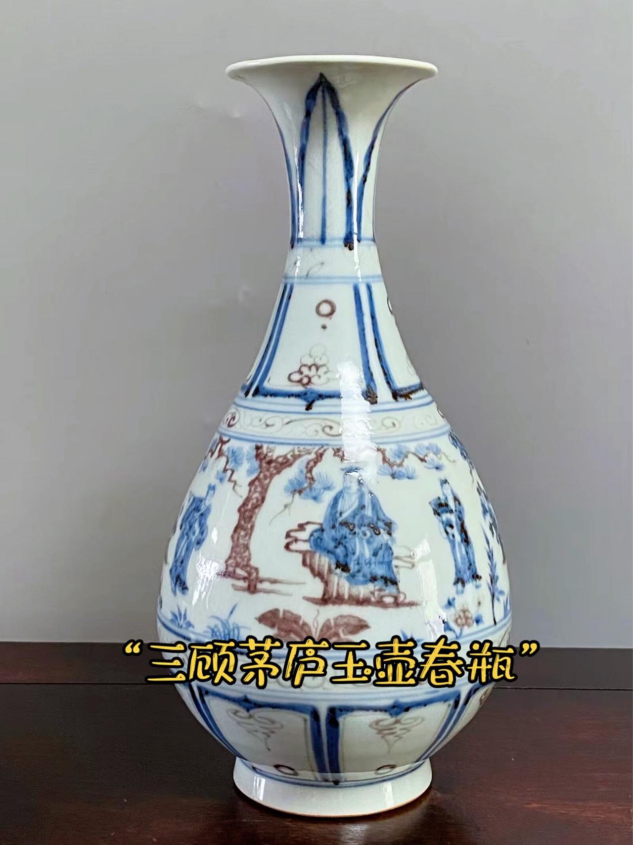 元代青花釉里红瓷器欣赏,萧何月下追韩信小荷叶盖罐,三顾茅庐玉壶春瓶!元青花 瓷器