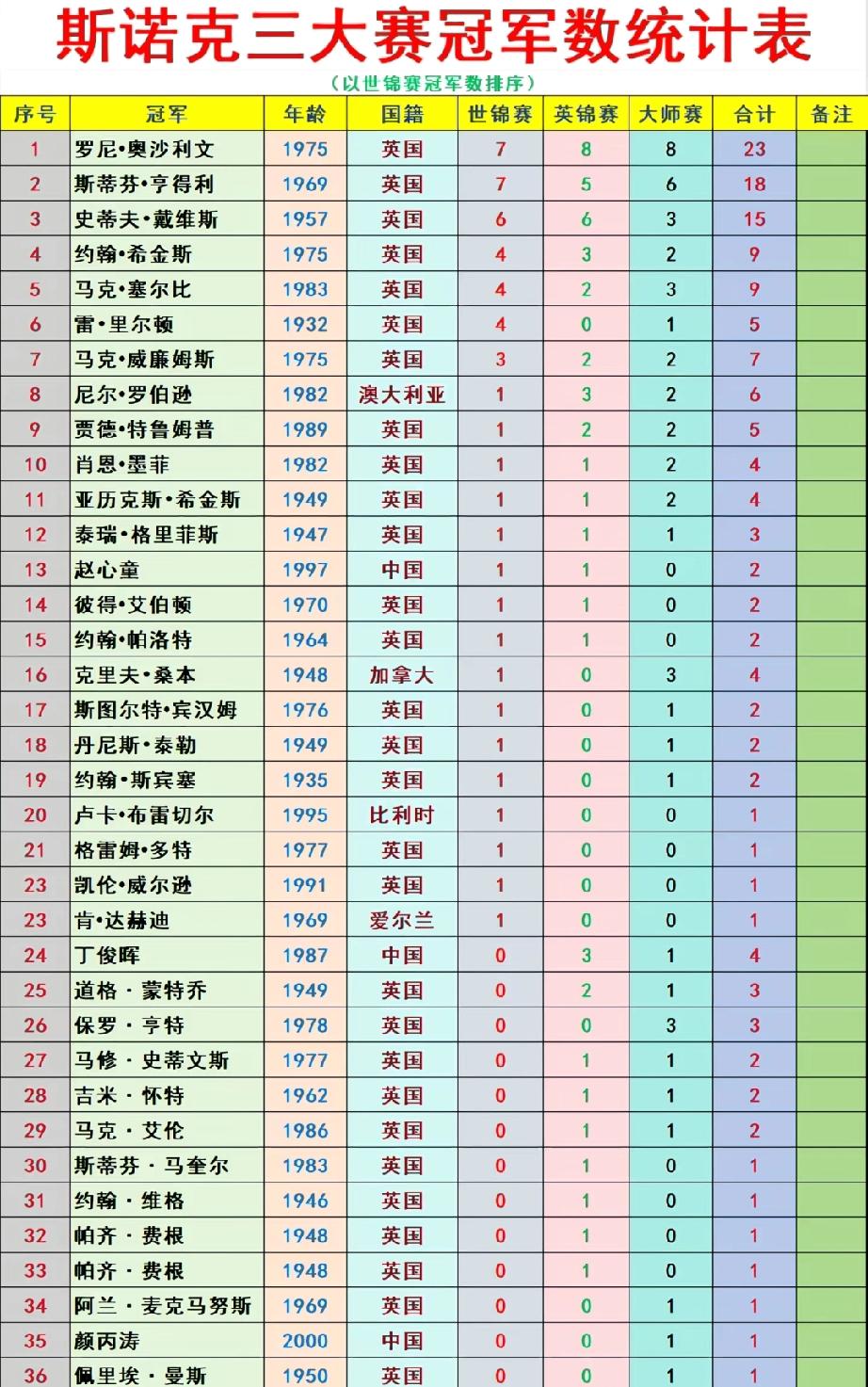 先来看看历史前十都有谁(三大赛冠军数,斯诺克未普及时除外):