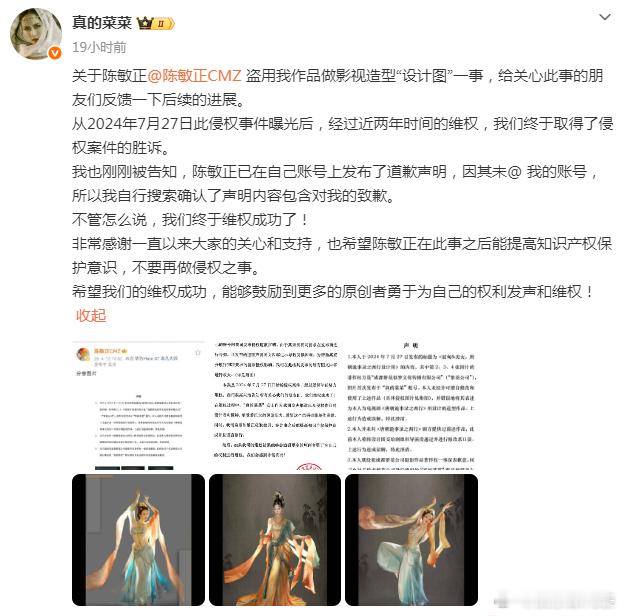 唐诡2造型师就侵权道歉 13日,《唐朝诡事录之西行》造型师陈敏正就盗用网友真的菜菜作品做影视造型“设计图”一事道歉,她本人回应:“不管怎么说,我们终于维权成功了!非常感谢一直以来大家的关心和支持,也希望陈敏正在此事之后能提高知识产权保护意识,不要再做侵权之事。希望我们的维权成功,能够鼓励到更多的原创者勇于为自己的权利发声和维权!”