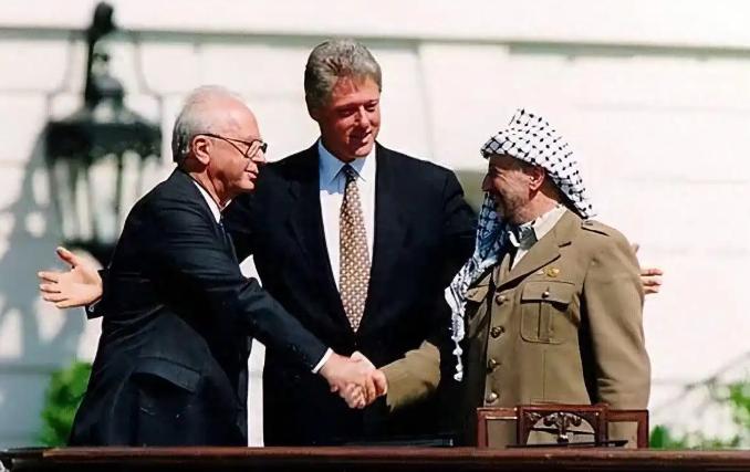 1993年,在克林顿的见证下,以色列总理拉宾,与巴勒斯坦领导人阿拉法特,签署言和协议。
